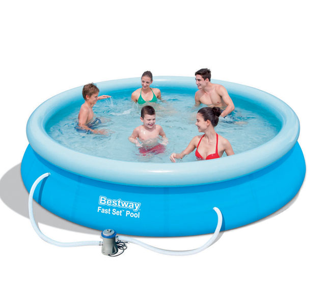 Bazén s vlastnou konštrukciou 366 x 76 cm + filter, objem vody (80 %) 5377 l. Bazén má jednu nafukovaciu komoru, po nafúknutí sa postaví jednoduchým naplnením vodou.