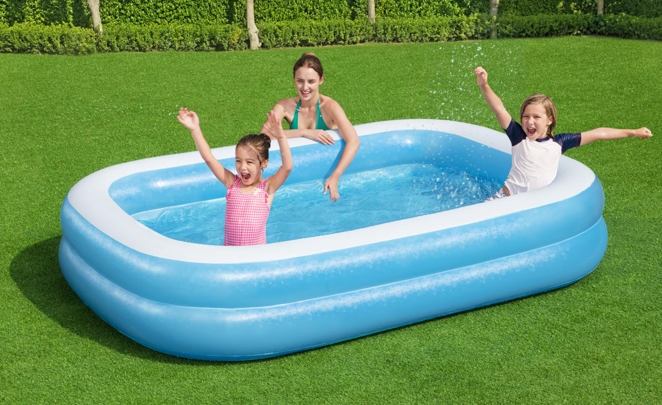 Obdĺžnikový nafukovací bazén Medium Family dvojkomorový, priehľadné steny, 269 x 175 x 51 cm, pre deti od 6 rokov, objem vody (75 %) 982 l. Vhodný pre záhrady rodinných domov.