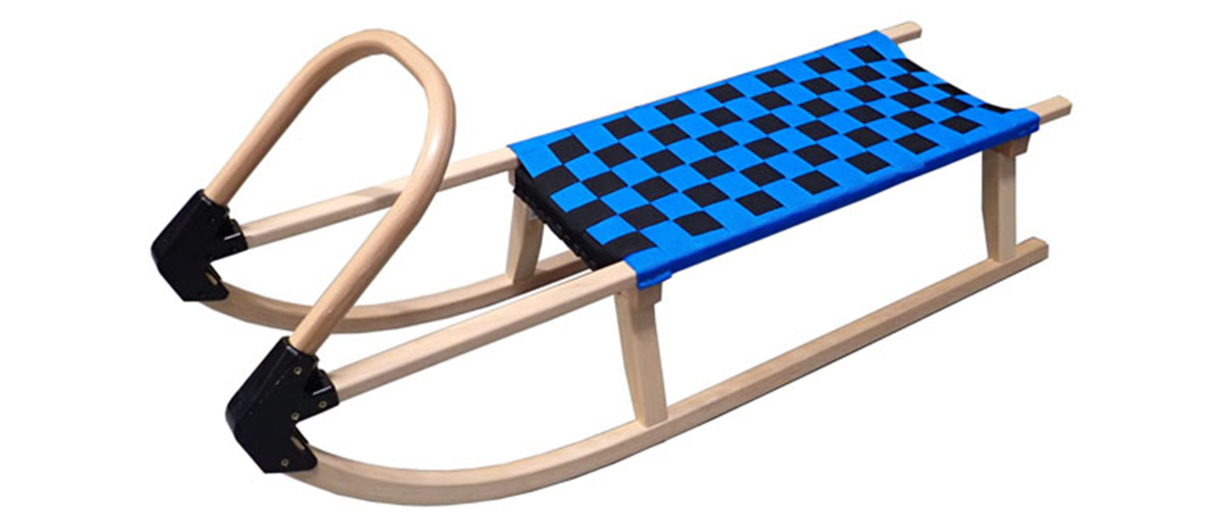 Celodrevené sane s textilným popruhom na sedadle a kovovými lyžinami. Dĺžka 105 - 110 cm, určené na rekreačný šport.