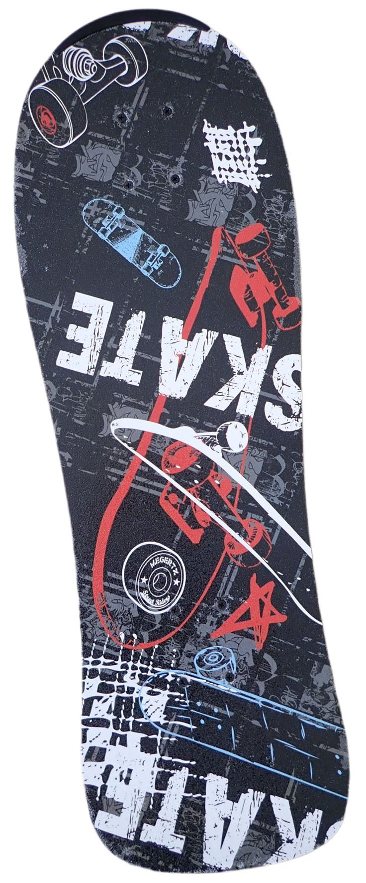 Skateboard farebný - čierny Plochý tvar s oválnou doskou a zahnutým koncom dosky v zadnej časti. V spodnej časti zadnej časti skateboardu je plastový ovál slúžiaci ako brzda…
