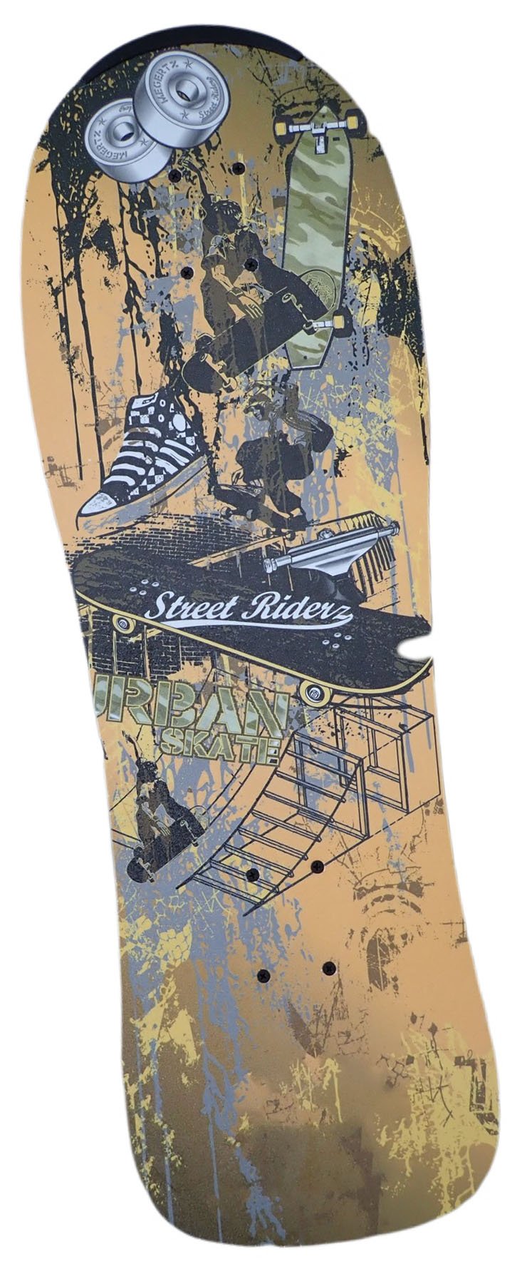 Skateboard farebný - žltý Plochý tvar s oválnou doskou a zahnutým koncom dosky na zadnej strane. V spodnej časti zadnej časti skateboardu je plastový ovál slúžiaci ako brzda…