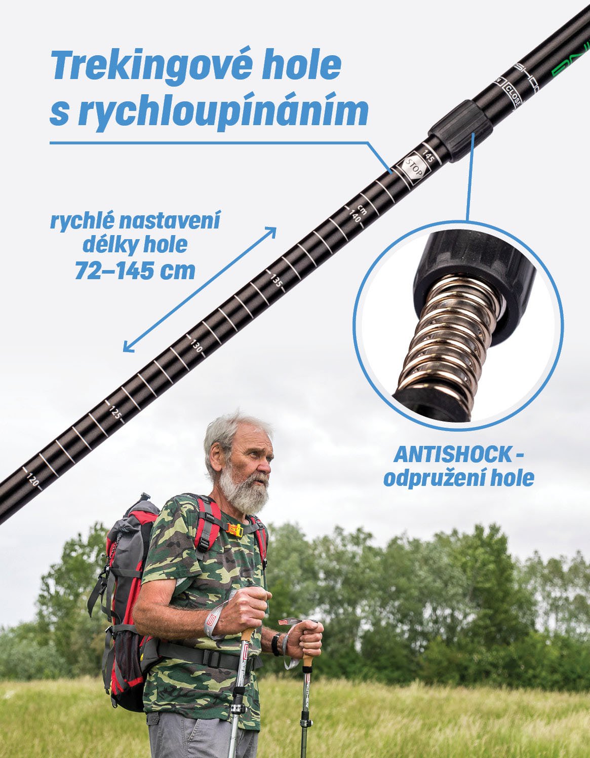 Teleskopické palice 3 kusy - vystužené ALU trubky so 40 % grafitu, ľahké , 72 - 145 cm. Korkové rukoväte sú ľahké a pohodlne sa držia.