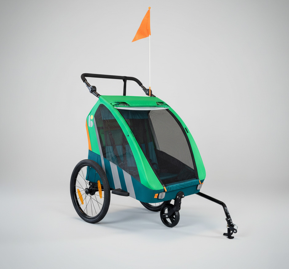 Skontrolujte bezpečnostné pásy (ideálne 5-bodové pre deti), parkovacie brzdy, reflexné prvky/vlajku a „bezpečnostnú poistku“ proti náhodnému odpojeniu. Trailblazer má spomínané reflexné prvky, vlajku a bezpečnostný popruh; B-Travel má 5-bodové bezpečnostné pásy + brzdu.