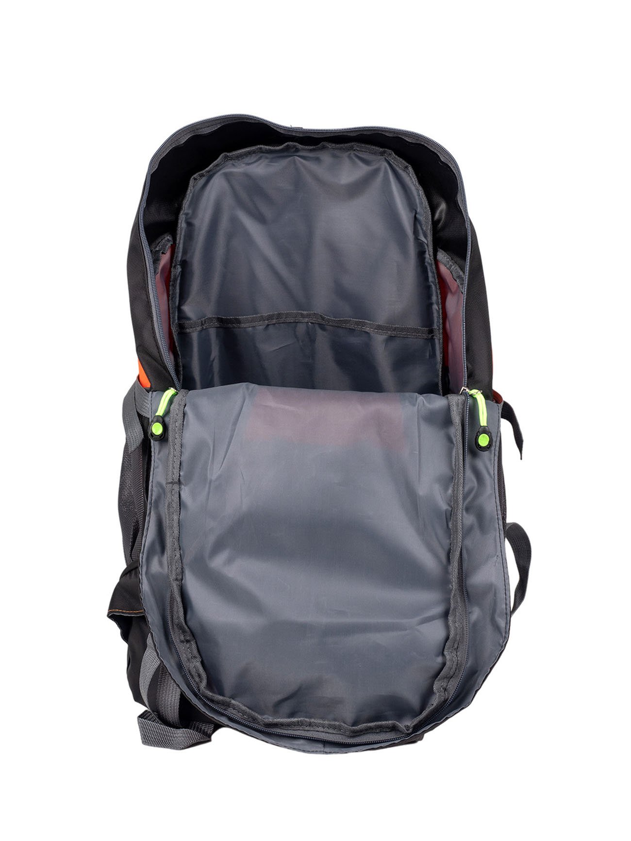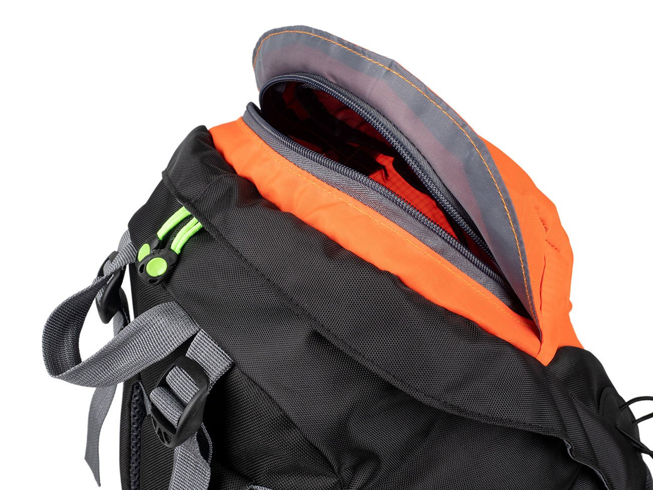 batoh má 2 hlavné priehradky s horným vstupom s obojstrannými zipsami, 2 sieťované vrecká po stranách batohu, predné otvorené vrecko a rukoväť na jednoduché prenášanie na hornej strane batohu