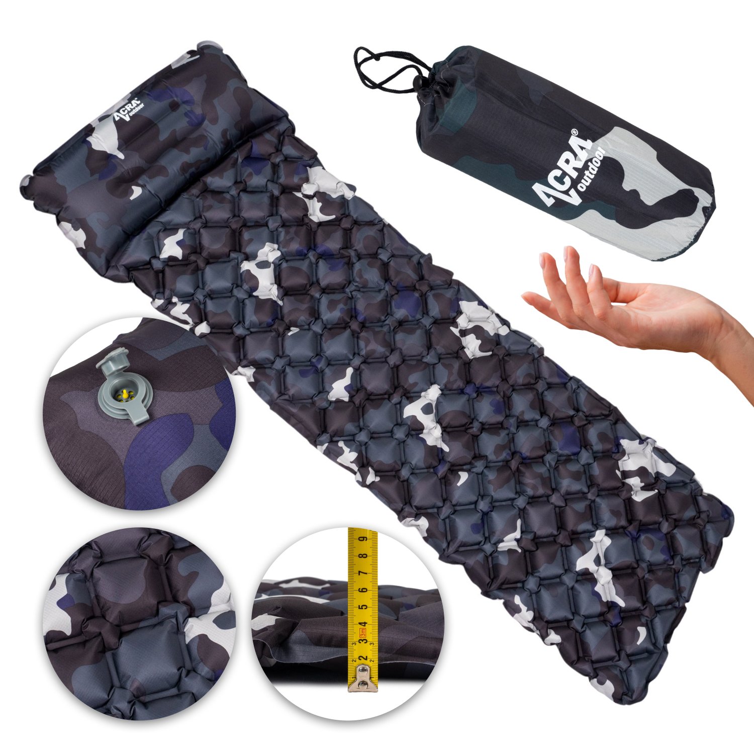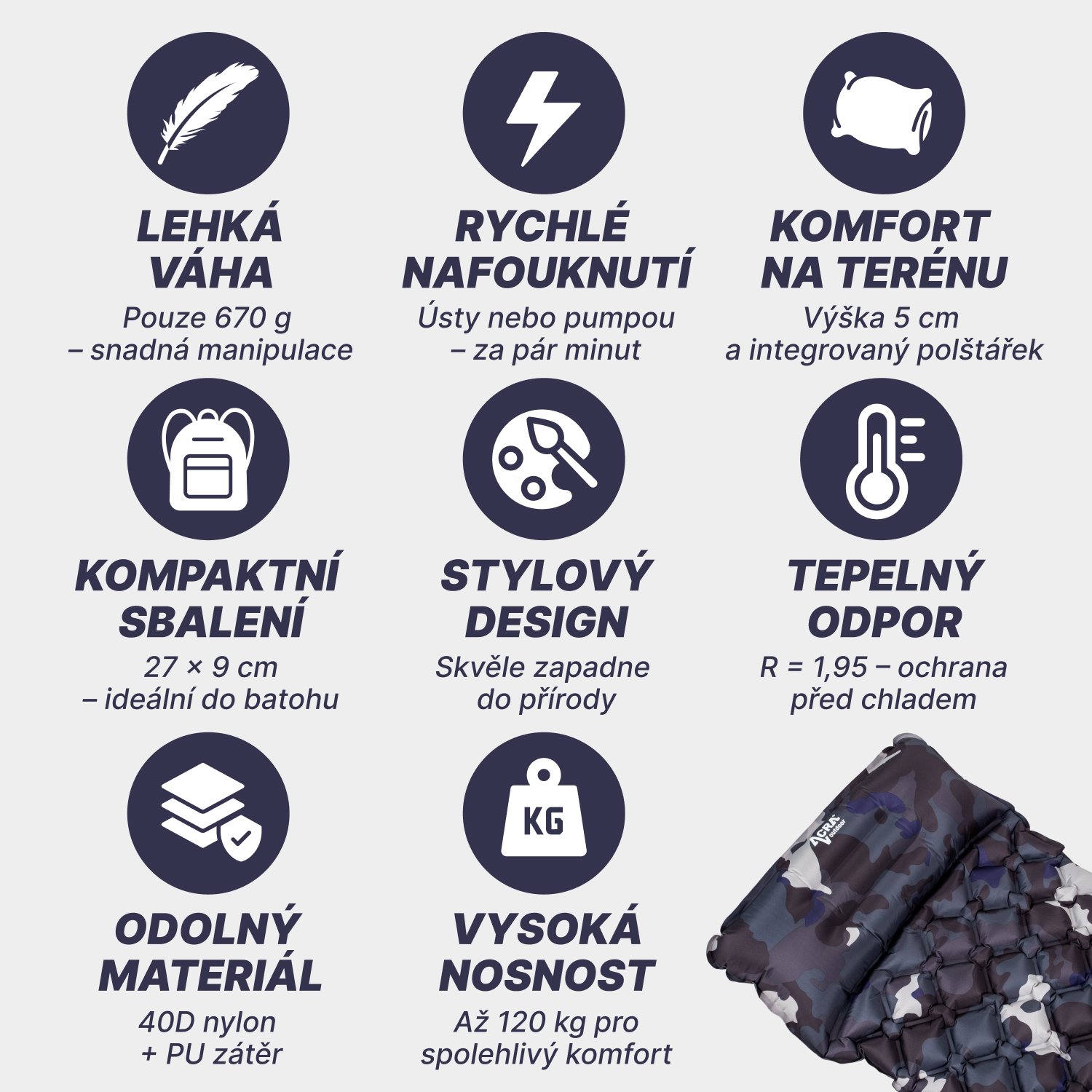ACRA L140M Sivý a béžový maskáčový nafukovací matrac: Ľahký a kompaktný spoločník pre náročných turistov! Hľadáte ľahký a kompaktný turistický matrac, ktorý vám zabezpečí pohodlie aj na tých najnáročnejších trasách? Potom je nafukovací matrac ACRA L140M sivej a béžovej farby s malým maskovaním tou správnou voľbou! Hlavné vlastnosti: Lahký a kompaktný: matrac sa ľahko zbalí do malého balíka s rozmermi 27 x 9 cm a hmotnosťou 670 g. Ideálny do menších batohov a pre tých, ktorí ocenia nízku hmotnosť. Rozmery. Rýchle a jednoduché nafúknutie:matrac sa dá ľahko nafúknuť ústami alebo pomocou veľkoobjemovej nafukovacej pumpy. Nafúknutie trvá len niekoľko minút. Tepelný komfort: Tepelný odpor matraca R = 1,95 m2.K.W(-1) vás príjemne zahreje aj počas chladnejších nocí.Odolný a odolný: Vyrobený z kvalitného nylonu 40D s PU poťahom je karimatka odolná voči roztrhnutiu a opotrebovaniu. Kompaktné balenie:Karimatka sa dodáva v kompaktnom balení, ktoré sa ľahko zmestí do batohu. Nosnosť do 120 kg: Karimatka je určená pre osoby s maximálnou hmotnosťou 120 kg.Farba: Karimatka je k dispozícii v štýlovom sivom a béžovom maskáčovom variante. Zelená nafukovacia karimatka ACRA L140M je ideálnou voľbou pre všetkých náročných turistov, táborníkov a cyklistov, ktorí ocenia kompaktnosť, nízku hmotnosť, rýchle nafúknutie, maximálne pohodlie a odolnosť. Tip: Pre ešte väčšie pohodlie si so sebou na výlet vezmite spací vak Dôležité: NEVYSTAVUJTE ho priamemu slnečnému žiareniu a chráňte pred extrémnymi teplotami!!!