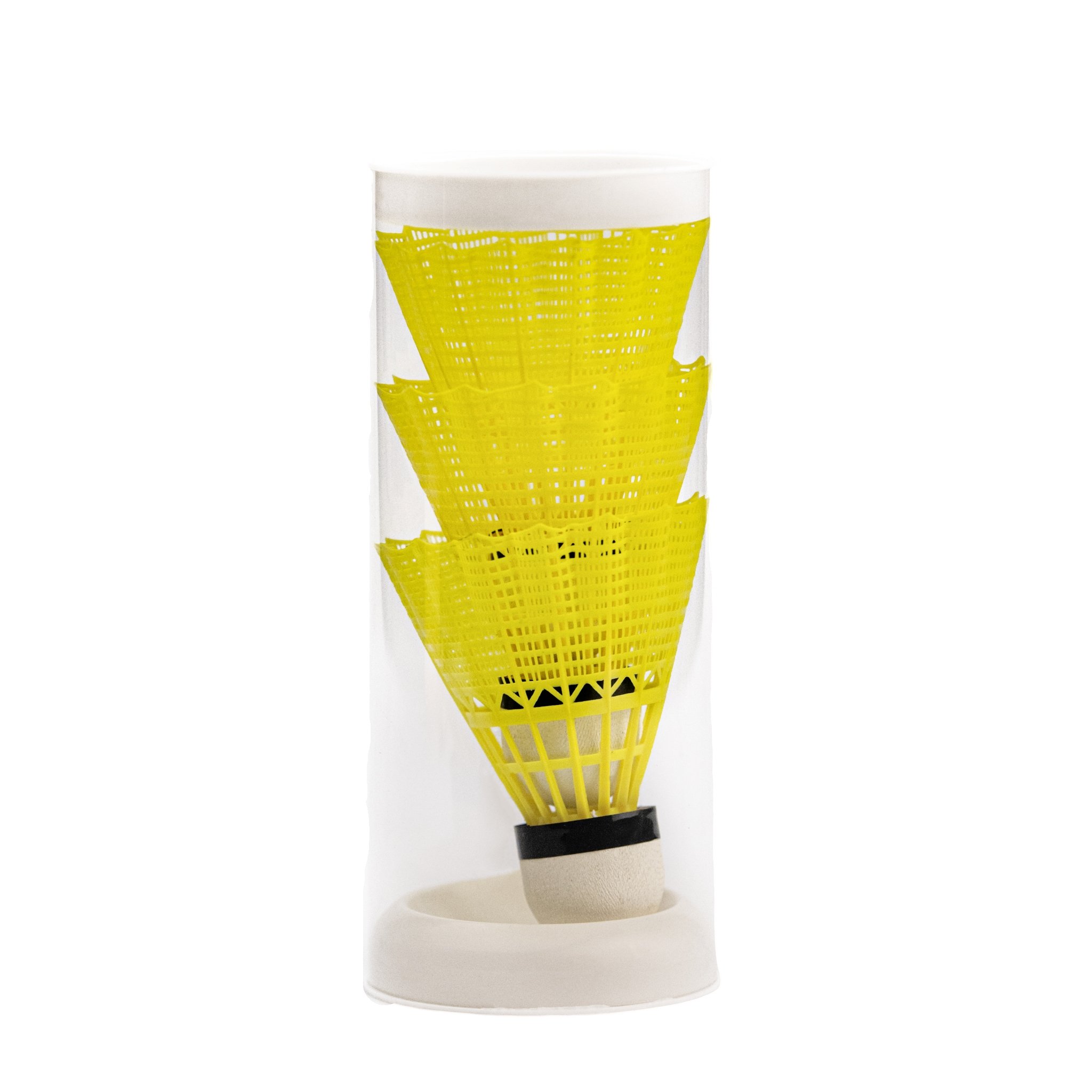Materiál vozíka/krídla: Odolný nylon. Nylonové košíčky sú známe svojou vysokou trvanlivosťou a odolnosťou voči praskaniu, vďaka čomu sú ideálnou voľbou na rekreačné a tréningové použitie, pri ktorom sa kladie dôraz na dlhú životnosť loptičky.Materiál hlavičky:Korková hlavička. Táto hlava poskytuje loptičke dobré letové vlastnosti a stabilnú trajektóriu, ako aj príjemný pocit pri dopade, podobne ako pri drahších loptičkách.Farba:Jasne žltá - táto výrazná farba zaisťuje výbornú viditeľnosť loptičky na akomkoľvek pozadí a v rôznych svetelných podmienkach.Balenie: Loptičky sa dodávajú v praktickom priehľadnom tubuse (krabici), ktorý ich chráni pred poškodením a uľahčuje ich skladovanie a prepravu.
