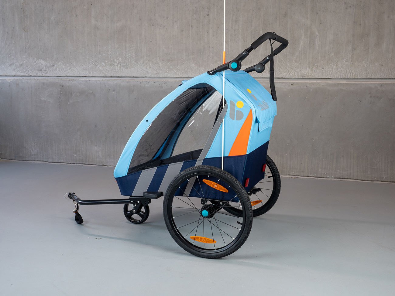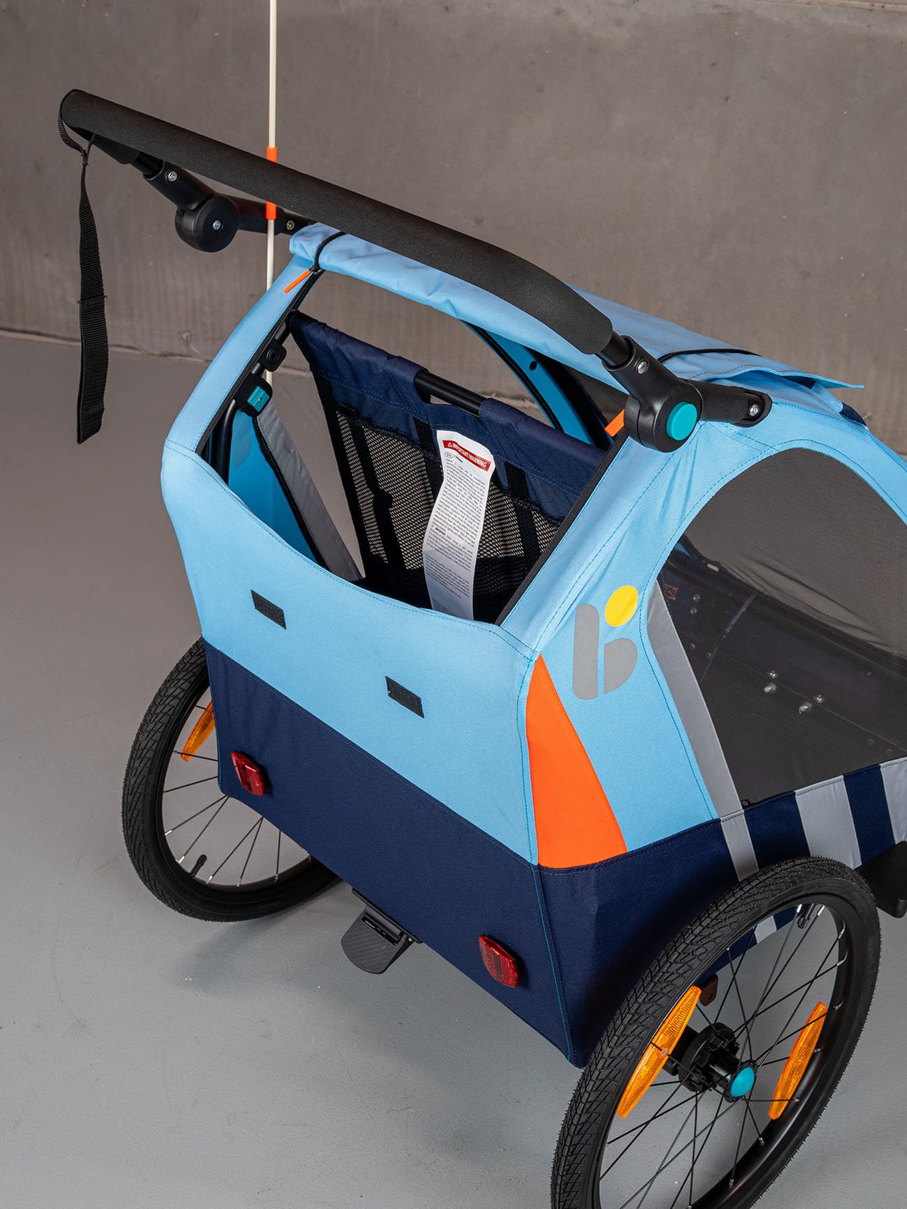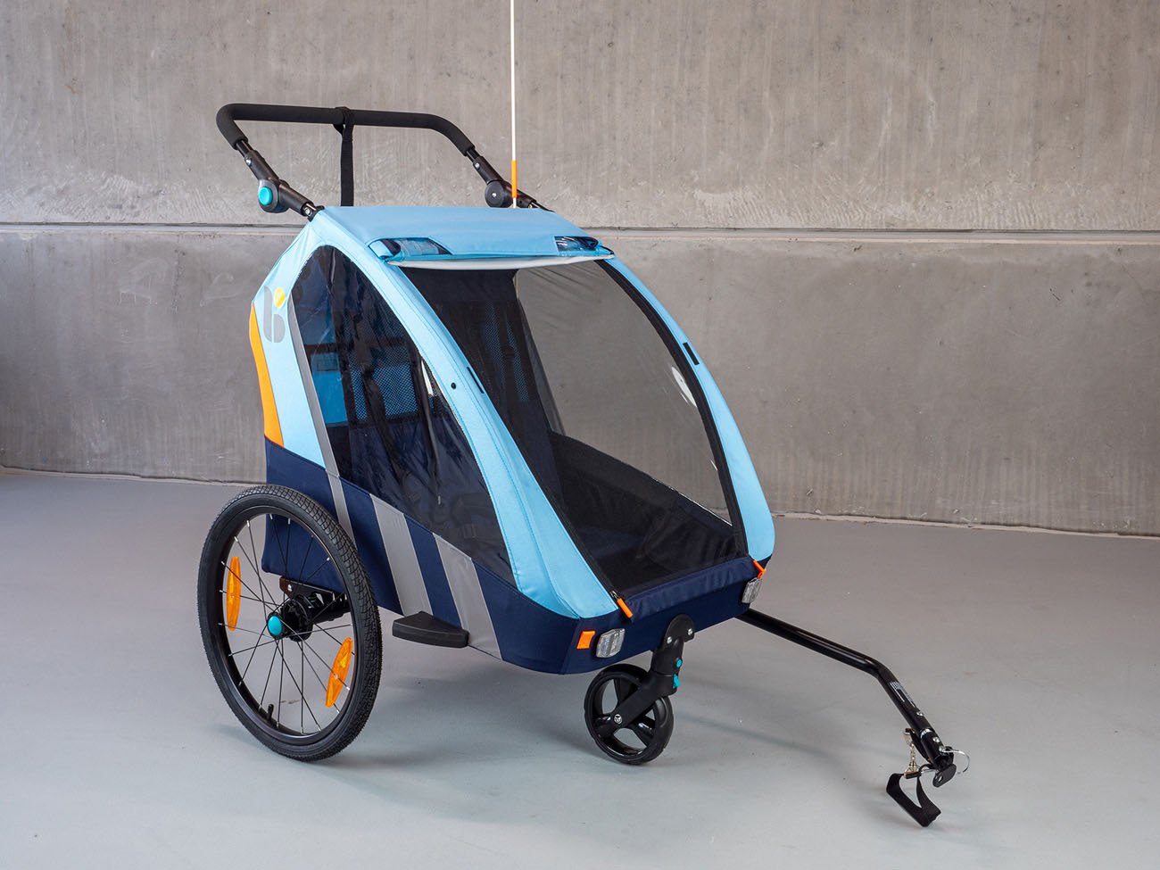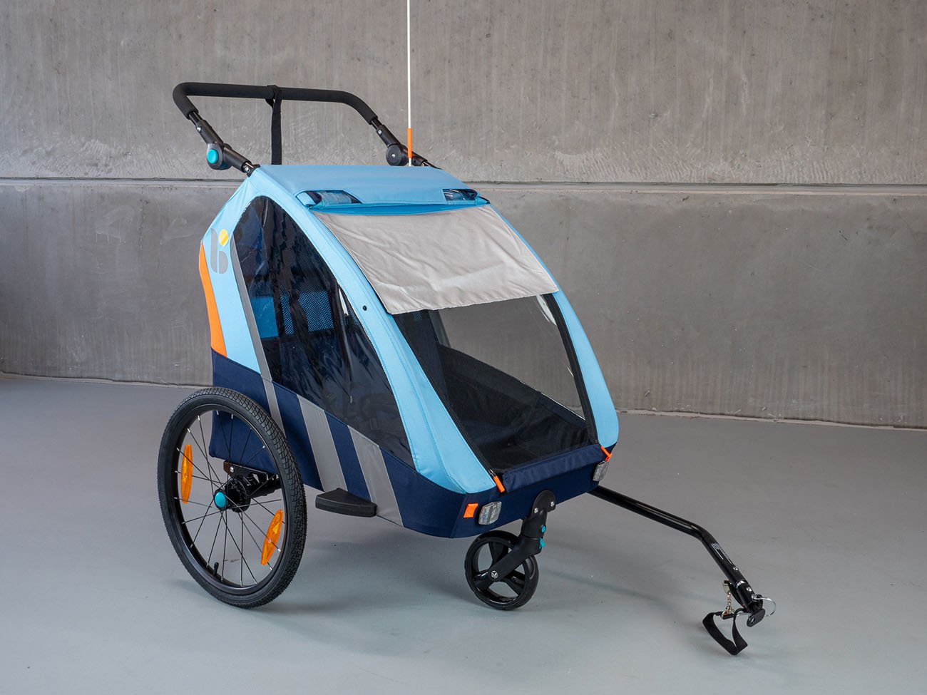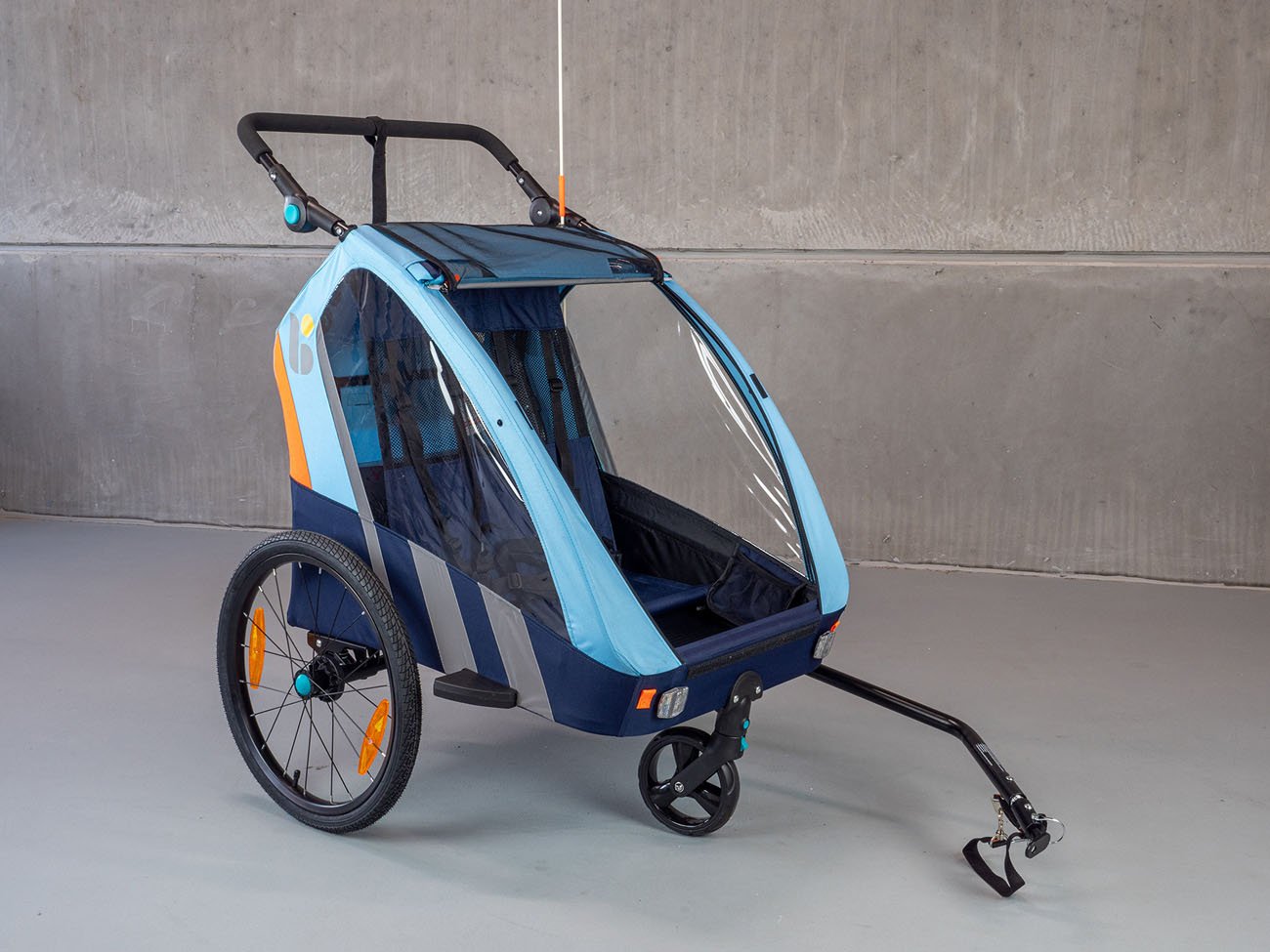 Detský prívesný vozík Trailblazer (2v1) pre bicykel v kombinácii so športovým kočíkom pre 2 deti je kvalitný model so všetkými certifikátmi na používanie na cestách. Základom je dvojkolesový vozík s ojom, ktorý možno zastúpiť tretím otočným kolesom, a tak vozík ľahko a rýchlo prestavať na športový kočík pre dve deti. Vozík je vyrobený z vodotesného pevného materiálu (PES 600D oxford) a je vybavený priehľadným PVC okienkom v prednej časti, dve menšie okienka sú aj v bočnej časti vozíka (kočíka), aby dieťa (deti) mali výhľad na okolie z vozíka. Kočík je tiež vybavený sťahovacou slnečnou strieškou a sieťkou proti hmyzu na použitie v dobrom počasí. Kočík má dve sedadlá s 5-bodovými bezpečnostnými pásmi, ktoré sú spojené jednou prackou upevnenou na hrudi dieťaťa. Prístup k vozíku je spredu a je veľmi pohodlný na uloženie detí. Kočík má nastaviteľnú tuhosť odpruženia, je vybavený bezpečnostnou parkovacou brzdou s jednoduchým ovládaním. Vozík je tiež vybavený reflexnými pruhmi na bokoch, odrazovými sklami vpredu a vzadu, ako aj výstražnou oranžovou vlajkou upevnenou na 150 cm dlhej pružnej tyči. Vozíček je vybavený dvomi stabilnými 20" kolesami (+ jedno otočné prídavné koleso uložené v špeciálnom vrecku na vozíku). Okrem toho má vozík v zadnej časti veľký priestor na spanie. Robustná a ľahká konštrukcia s jednoduchou možnosťou prestavby vozíka na kočík robí z vozíka atraktívny prostriedok, ktorý umožňuje športovo založeným rodičom pohybovať sa vonku aj s malými deťmi. Vozík sa upína na nápravu zadného kolesa. Ako bezpečnostné zariadenie na zabránenie odpojenia vozíka sa dodáva popruh s karabínou, ktorý sa upína na rám kolesa a slúži na zabezpečenie vozíka proti odpojeniu aj v prípade uvoľnenia upínacej matice.