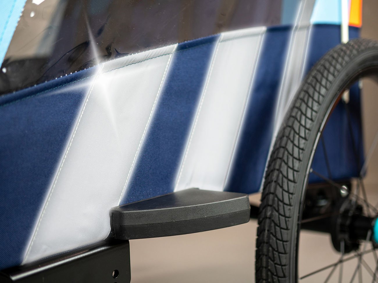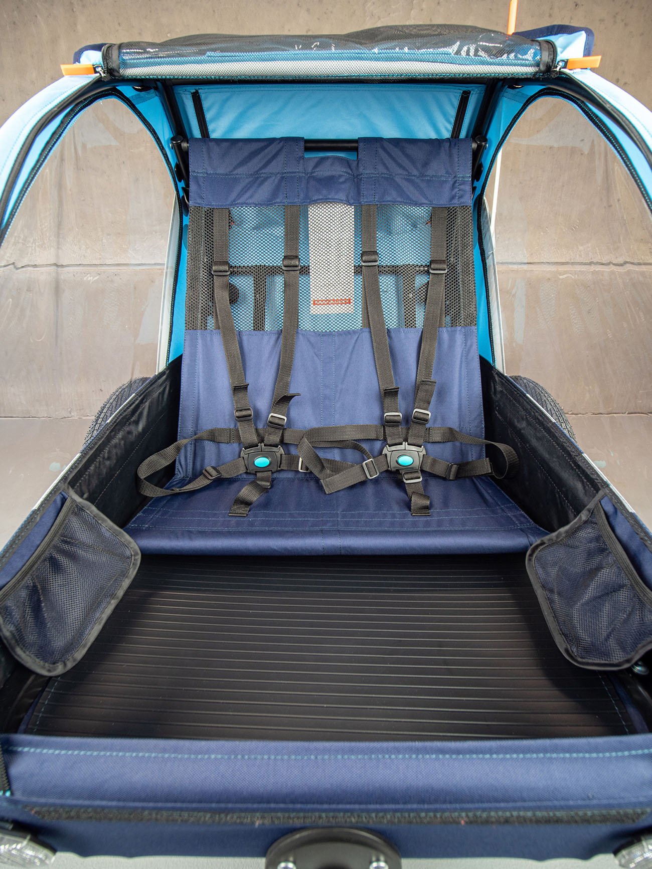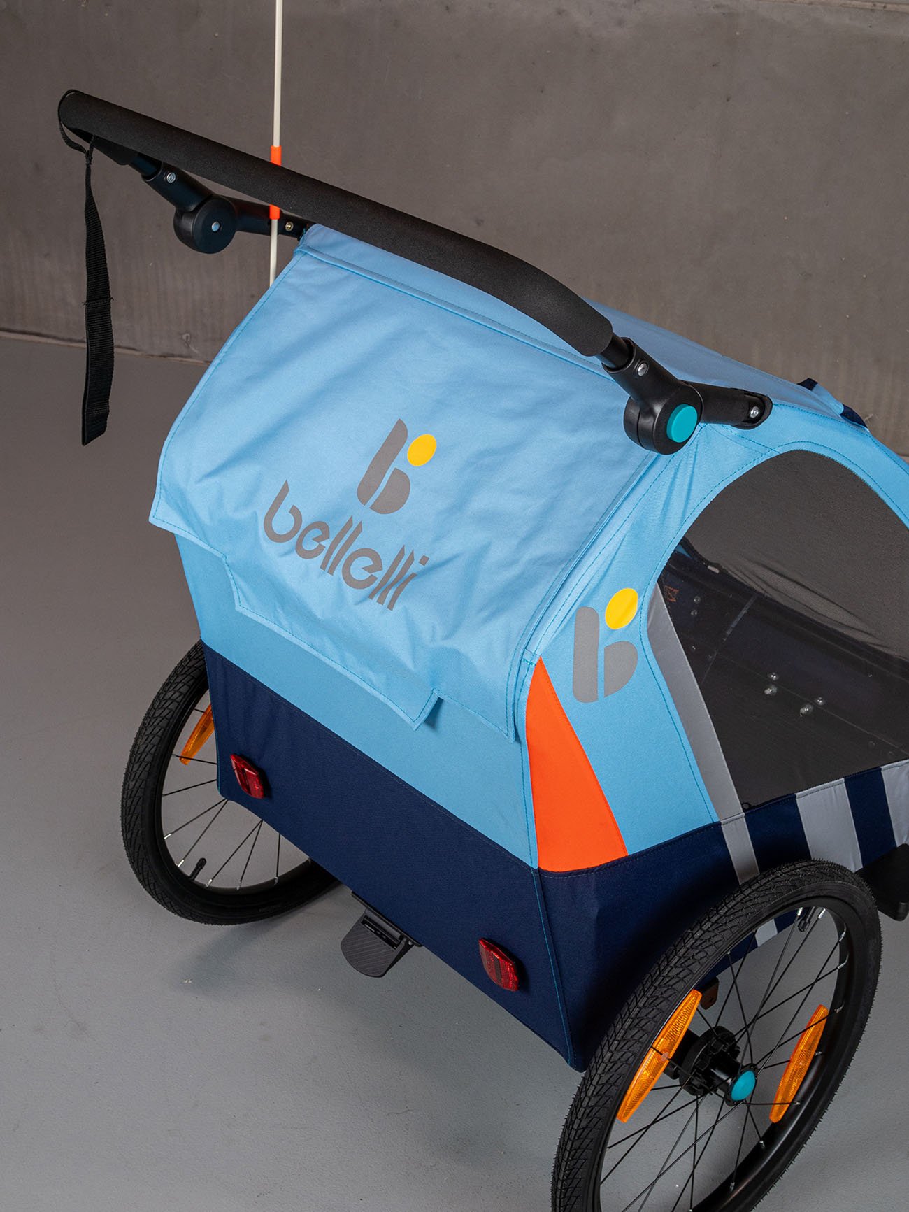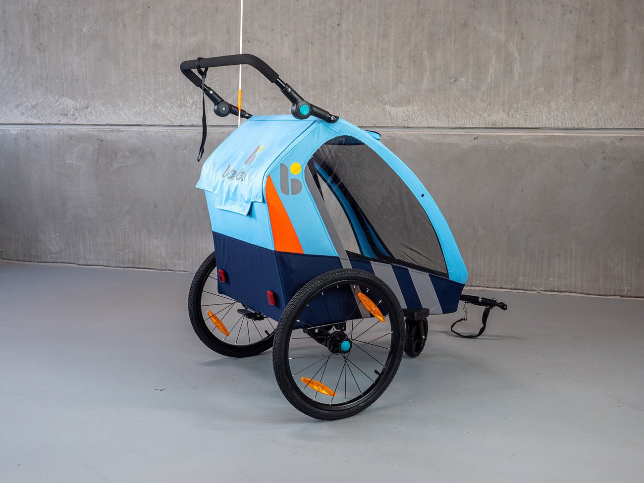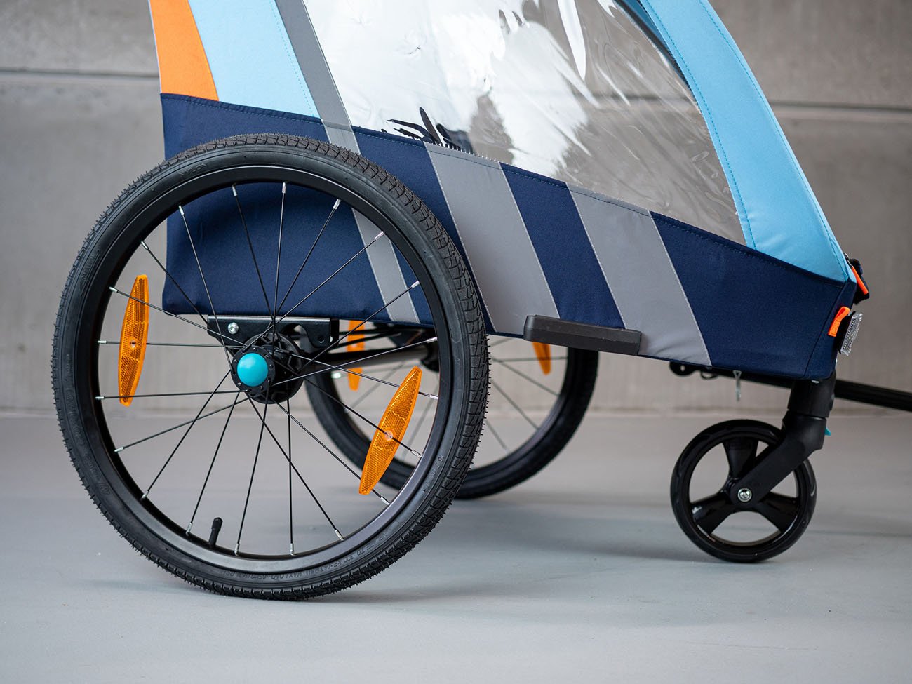 Detský prívesný vozík Trailblazer (2v1) pre bicykel v kombinácii so športovým kočíkom pre 2 deti je kvalitný model so všetkými certifikátmi na používanie na cestách. Základom je dvojkolesový vozík s ojom, ktorý možno zastúpiť tretím otočným kolesom, a tak vozík ľahko a rýchlo prestavať na športový kočík pre dve deti. Vozík je vyrobený z vodotesného pevného materiálu (PES 600D oxford) a je vybavený priehľadným PVC okienkom v prednej časti, dve menšie okienka sú aj v bočnej časti vozíka (kočíka), aby dieťa (deti) mali výhľad na okolie z vozíka. Kočík je tiež vybavený sťahovacou slnečnou strieškou a sieťkou proti hmyzu na použitie v dobrom počasí. Kočík má dve sedadlá s 5-bodovými bezpečnostnými pásmi, ktoré sú spojené jednou prackou upevnenou na hrudi dieťaťa. Prístup k vozíku je spredu a je veľmi pohodlný na uloženie detí. Kočík má nastaviteľnú tuhosť odpruženia, je vybavený bezpečnostnou parkovacou brzdou s jednoduchým ovládaním. Vozík je tiež vybavený reflexnými pruhmi na bokoch, odrazovými sklami vpredu a vzadu, ako aj výstražnou oranžovou vlajkou upevnenou na 150 cm dlhej pružnej tyči. Vozíček je vybavený dvomi stabilnými 20" kolesami (+ jedno otočné prídavné koleso uložené v špeciálnom vrecku na vozíku). Okrem toho má vozík v zadnej časti veľký priestor na spanie. Robustná a ľahká konštrukcia s jednoduchou možnosťou prestavby vozíka na kočík robí z vozíka atraktívny prostriedok, ktorý umožňuje športovo založeným rodičom pohybovať sa vonku aj s malými deťmi. Vozík sa upína na nápravu zadného kolesa. Ako bezpečnostné zariadenie na zabránenie odpojenia vozíka sa dodáva popruh s karabínou, ktorý sa upína na rám kolesa a slúži na zabezpečenie vozíka proti odpojeniu aj v prípade uvoľnenia upínacej matice.