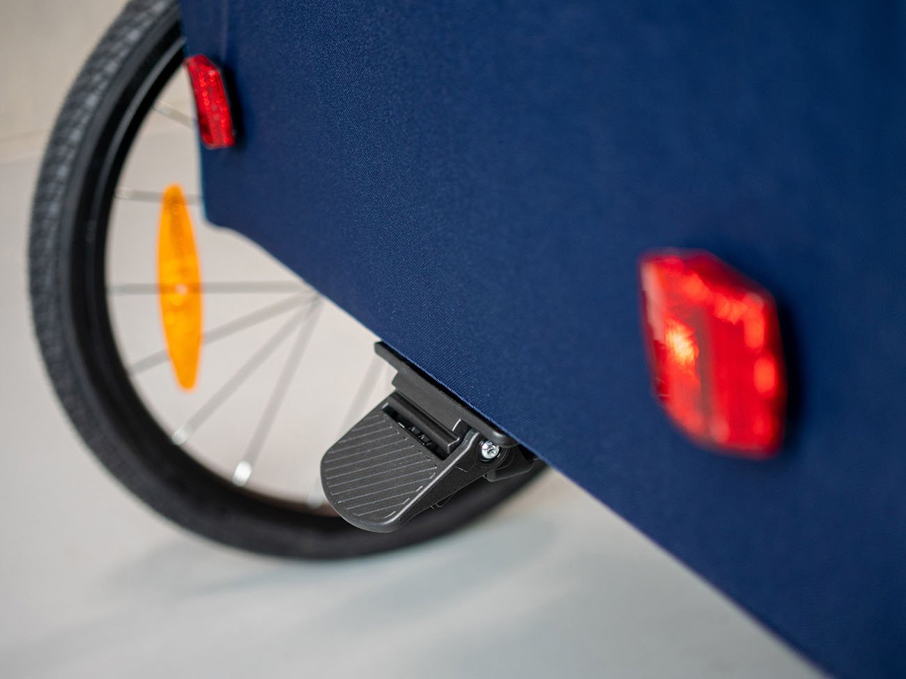 jednoduché pripevnenie k zadnej náprave kolies, zaistené upínacím popruhom s karabínou, ktorý zabraňuje odpojeniu vozíka počas jazdy