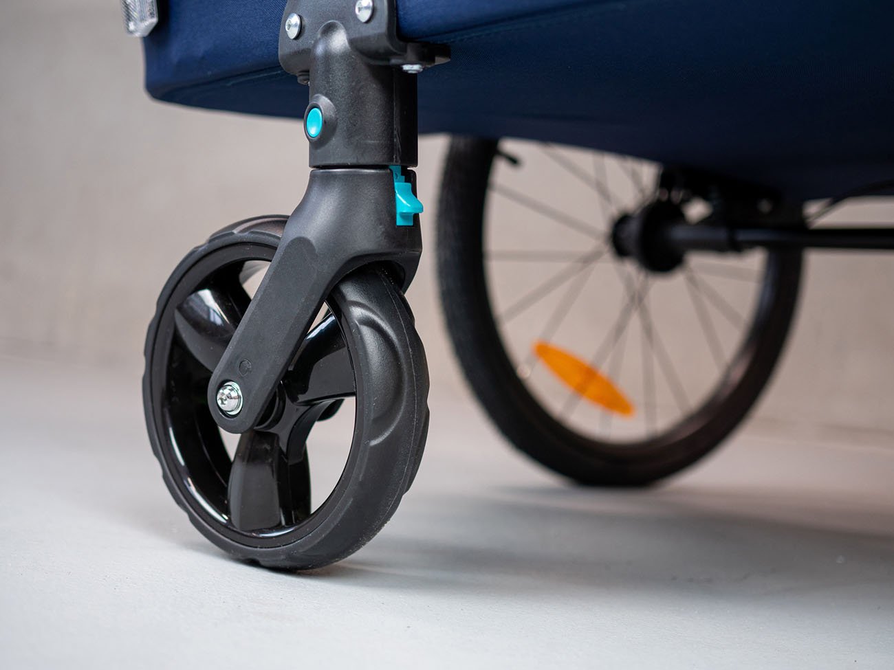 20" kolesá - dve pevné, tretie otočné na premenu vozíka na kočík (zároveň sa ťažná tyč ľahko zasunie do rámu vozíka,