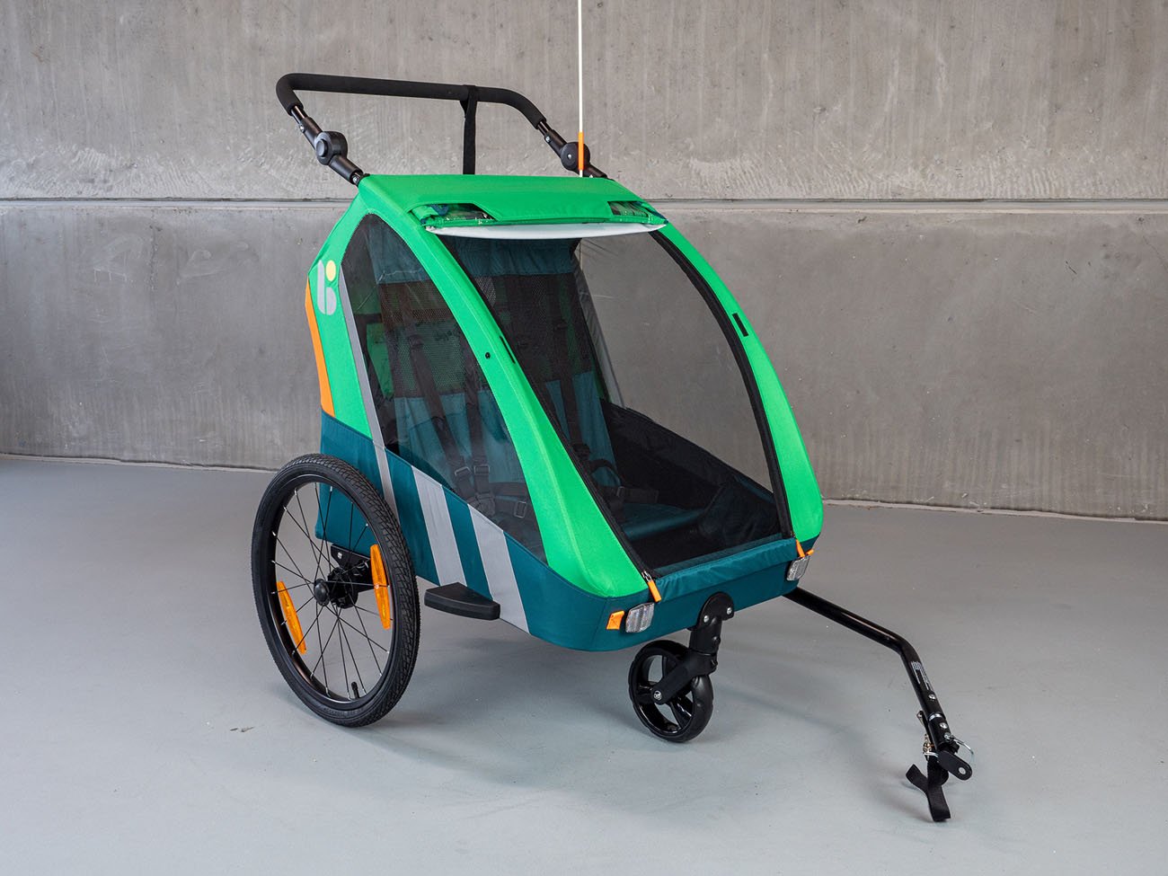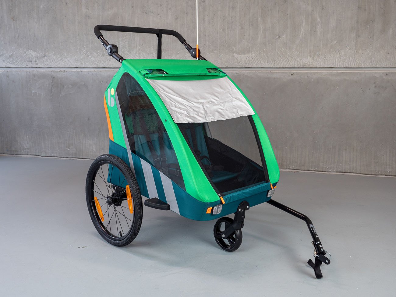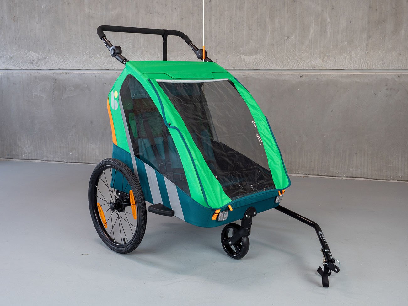 Detský prívesný vozík Trailblazer (2v1) pre bicykel v kombinácii so športovým kočíkom pre 2 deti je kvalitný model so všetkými certifikátmi na používanie na cestách. Základom je dvojkolesový vozík s ojom, ktorý možno zastúpiť tretím otočným kolesom, a tak vozík ľahko a rýchlo prestavať na športový kočík pre dve deti. Vozík je vyrobený z vodotesného pevného materiálu (PES 600D oxford) a je vybavený priehľadným PVC okienkom v prednej časti, dve menšie okienka sú aj na boku vozíka (kočíka), aby dieťa (deti) mali výhľad na okolie. Kočík je tiež vybavený sťahovacou slnečnou strieškou a sieťkou proti hmyzu na použitie v dobrom počasí. Kočík má dve sedadlá s 5-bodovými bezpečnostnými pásmi, ktoré sú spojené jednou prackou upevnenou na hrudi dieťaťa. Prístup k vozíku je spredu a je veľmi pohodlný na uloženie detí. Kočík má nastaviteľnú tuhosť odpruženia, je vybavený bezpečnostnou parkovacou brzdou s jednoduchým ovládaním. Vozík je tiež vybavený reflexnými pruhmi na bokoch, odrazovými sklami vpredu a vzadu, ako aj 150 cm vysokou oranžovou výstražnou vlajkou. Vozíček je vybavený dvomi stabilnými 20" kolesami (+ jedno otočné prídavné koleso uložené v špeciálnom vrecku na vozíku). Okrem toho má vozík v zadnej časti veľký priestor na spanie. Robustná a ľahká konštrukcia s jednoduchou možnosťou prestavby vozíka na kočík robí z vozíka atraktívny prostriedok, ktorý umožňuje športovo založeným rodičom pohyb vonku aj s malými deťmi. Vozík sa upína na nápravu zadného kolesa. Ako bezpečnostné zariadenie na zabránenie odpojenia vozíka sa dodáva popruh s karabínou, ktorý sa upína na rám kolesa a slúži na zabezpečenie vozíka proti odpojeniu aj v prípade uvoľnenia upínacej matice.