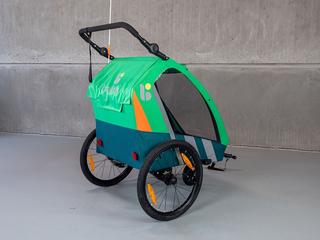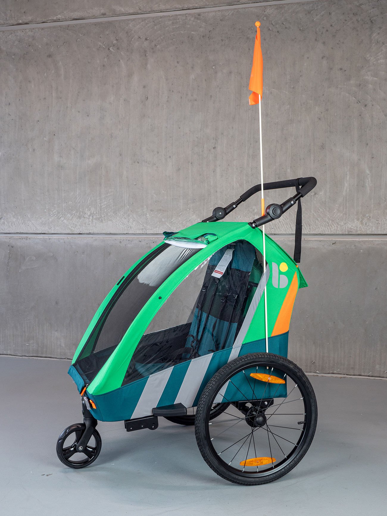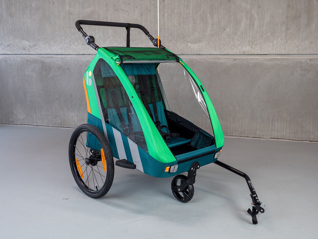 Detský prívesný vozík Trailblazer (2v1) pre bicykel v kombinácii so športovým kočíkom pre 2 deti je kvalitný model so všetkými certifikátmi na používanie na cestách. Základom je dvojkolesový vozík s ojom, ktorý možno zastúpiť tretím otočným kolesom, a tak vozík ľahko a rýchlo prestavať na športový kočík pre dve deti. Vozík je vyrobený z vodotesného pevného materiálu (PES 600D oxford) a je vybavený priehľadným PVC okienkom v prednej časti, dve menšie okienka sú aj na boku vozíka (kočíka), aby dieťa (deti) mali výhľad na okolie. Kočík je tiež vybavený sťahovacou slnečnou strieškou a sieťkou proti hmyzu na použitie v dobrom počasí. Kočík má dve sedadlá s 5-bodovými bezpečnostnými pásmi, ktoré sú spojené jednou prackou upevnenou na hrudi dieťaťa. Prístup k vozíku je spredu a je veľmi pohodlný na uloženie detí. Kočík má nastaviteľnú tuhosť odpruženia, je vybavený bezpečnostnou parkovacou brzdou s jednoduchým ovládaním. Vozík je tiež vybavený reflexnými pruhmi na bokoch, odrazovými sklami vpredu a vzadu, ako aj 150 cm vysokou oranžovou výstražnou vlajkou. Vozíček je vybavený dvomi stabilnými 20" kolesami (+ jedno otočné prídavné koleso uložené v špeciálnom vrecku na vozíku). Okrem toho má vozík v zadnej časti veľký priestor na spanie. Robustná a ľahká konštrukcia s jednoduchou možnosťou prestavby vozíka na kočík robí z vozíka atraktívny prostriedok, ktorý umožňuje športovo založeným rodičom pohyb vonku aj s malými deťmi. Vozík sa upína na nápravu zadného kolesa. Ako bezpečnostné zariadenie na zabránenie odpojenia vozíka sa dodáva popruh s karabínou, ktorý sa upína na rám kolesa a slúži na zabezpečenie vozíka proti odpojeniu aj v prípade uvoľnenia upínacej matice.