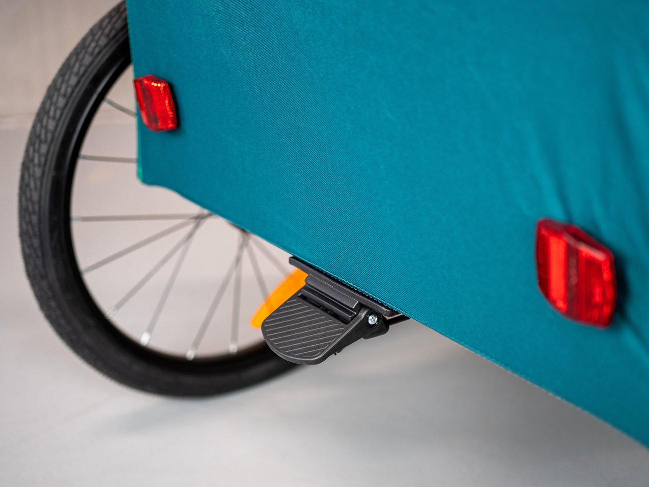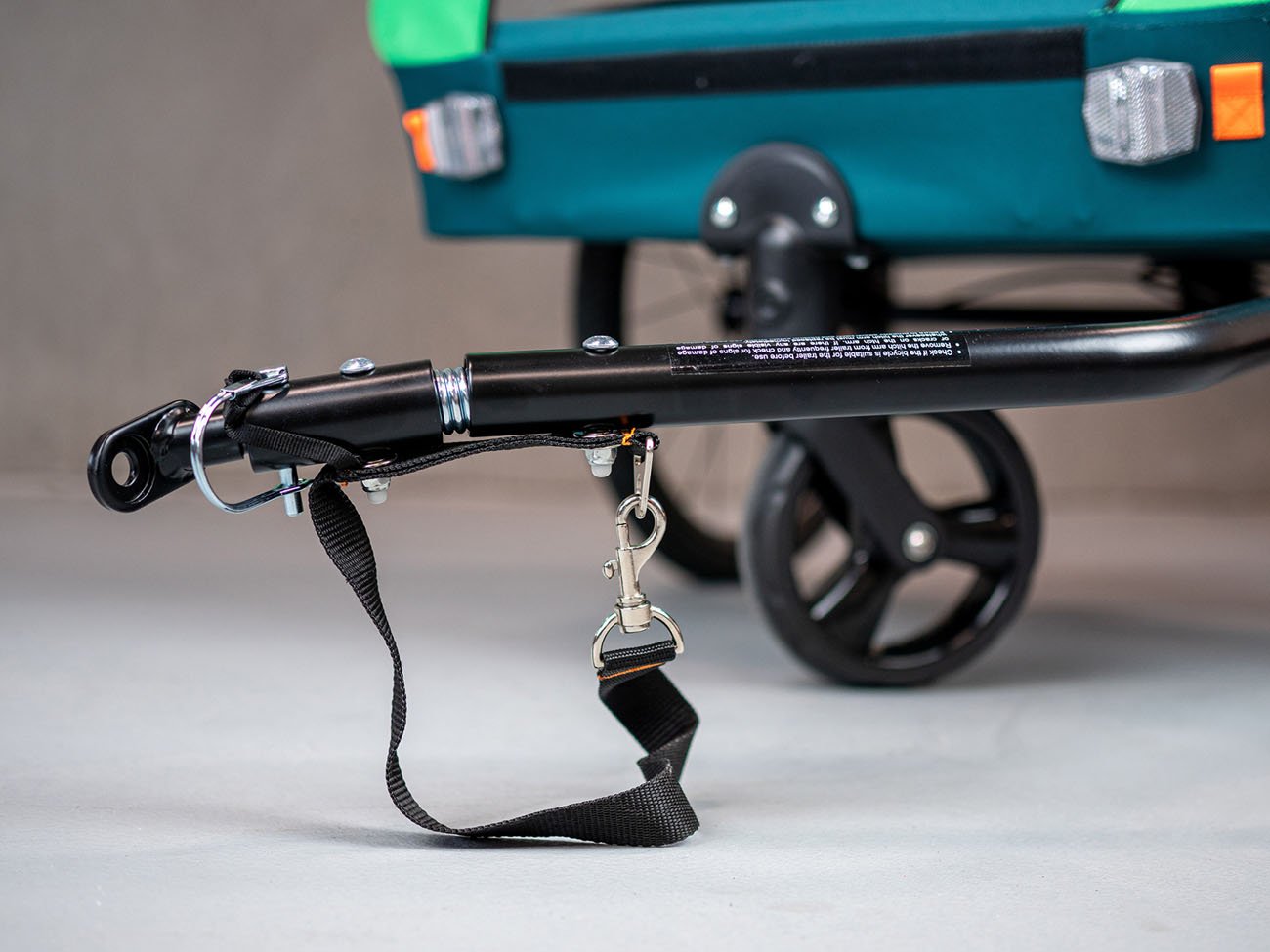 jednoduché pripevnenie k zadnej náprave kolies, zaistené upínacím popruhom s karabínou, ktorý zabraňuje odpojeniu vozíka počas jazdy