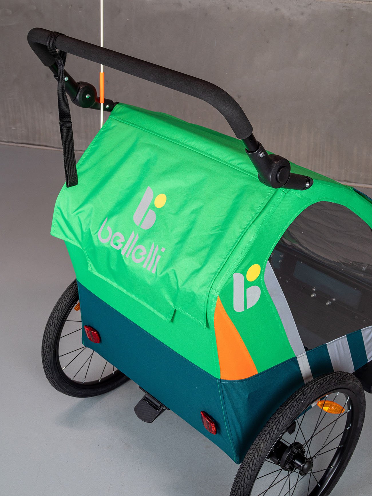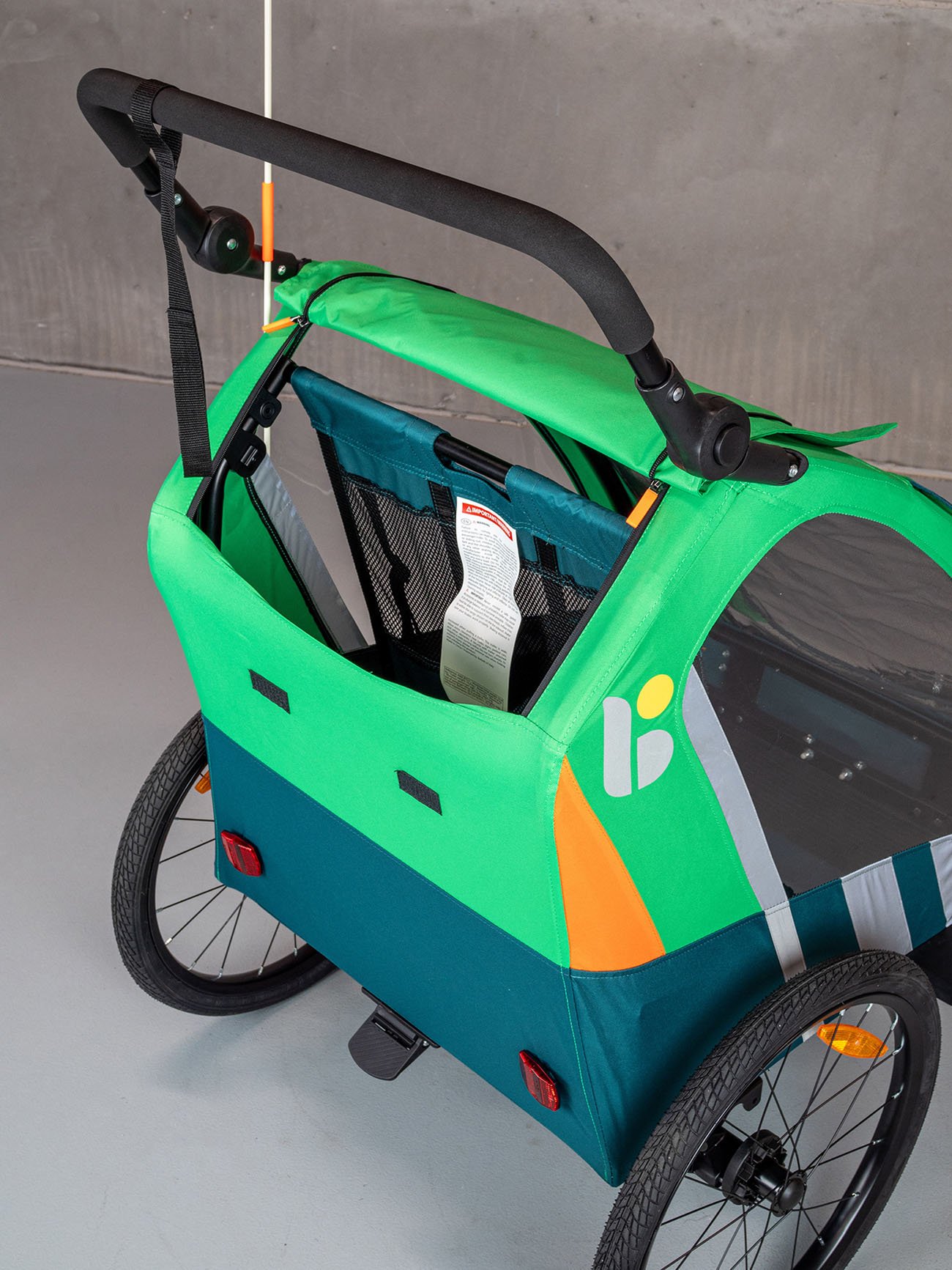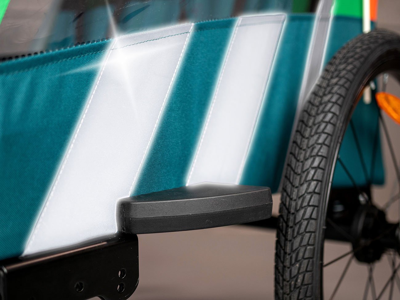 reflexné prvky okolo vozíka, farebná výstražná vlajka - na 150 cm dlhej tyči, odrazové sklá v prednej a zadnej časti vozíka