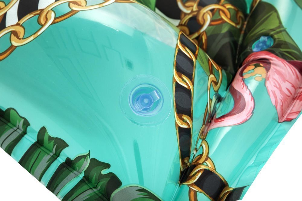 Nafukovacie lehátko s atraktívnou exotickou potlačou. Lehátko má nafukovací vankúš a päť nafukovacích ležiacich komôr so samostatným ventilom. Rozmery ležadla sú 183 x 69 cm.