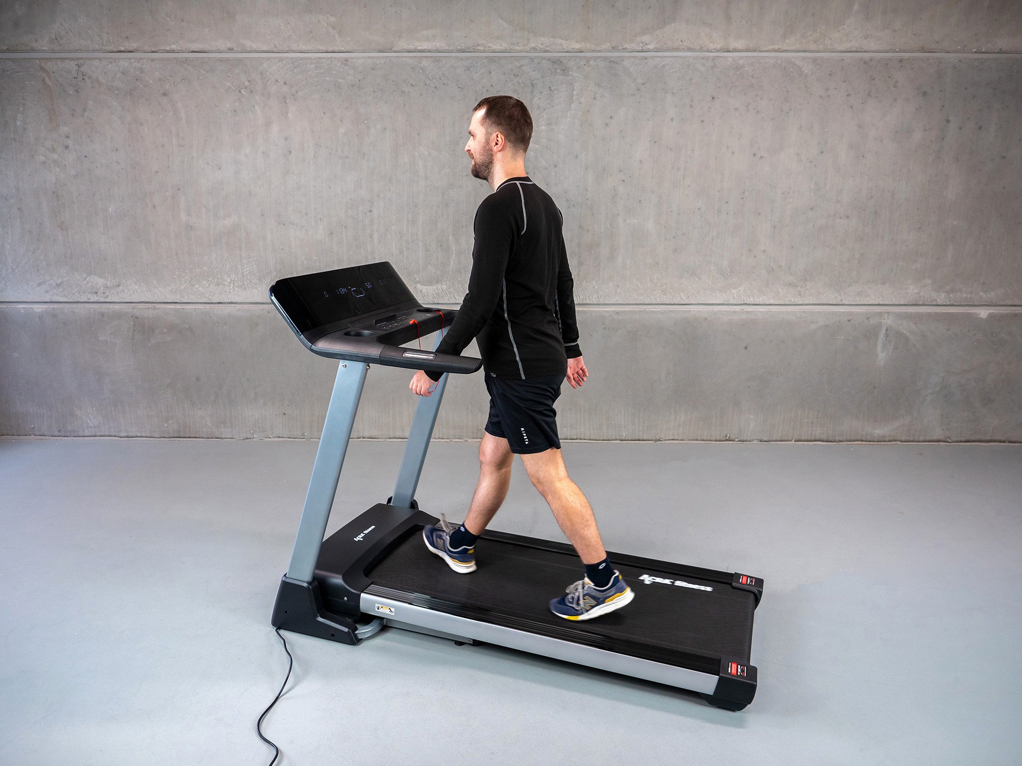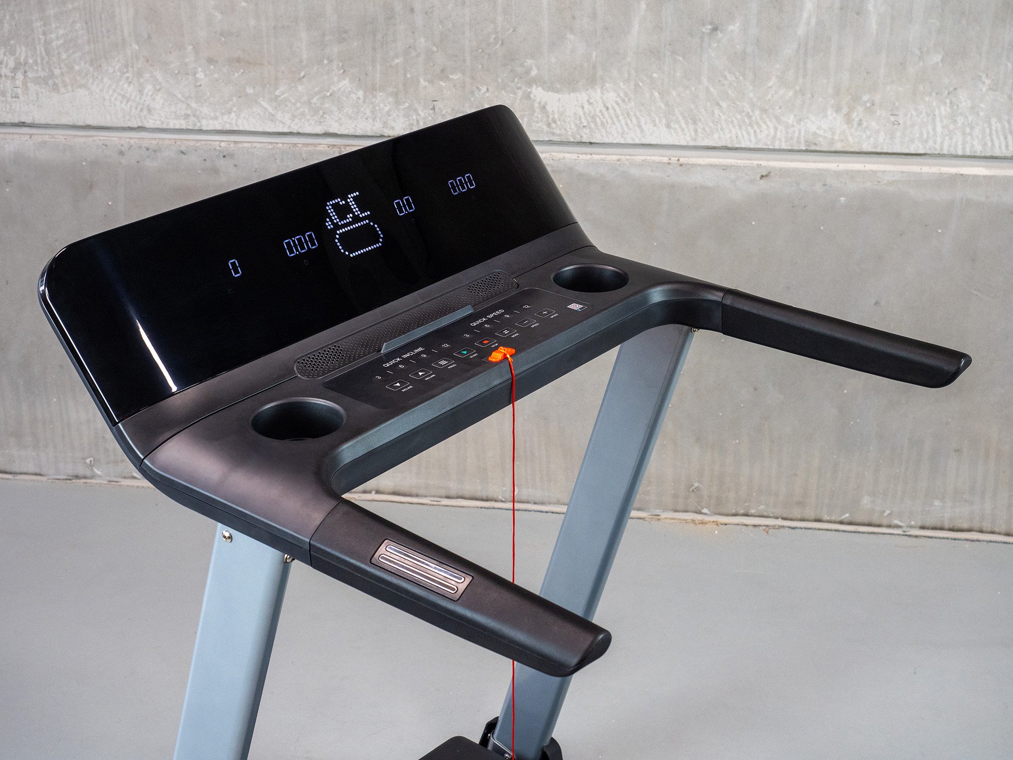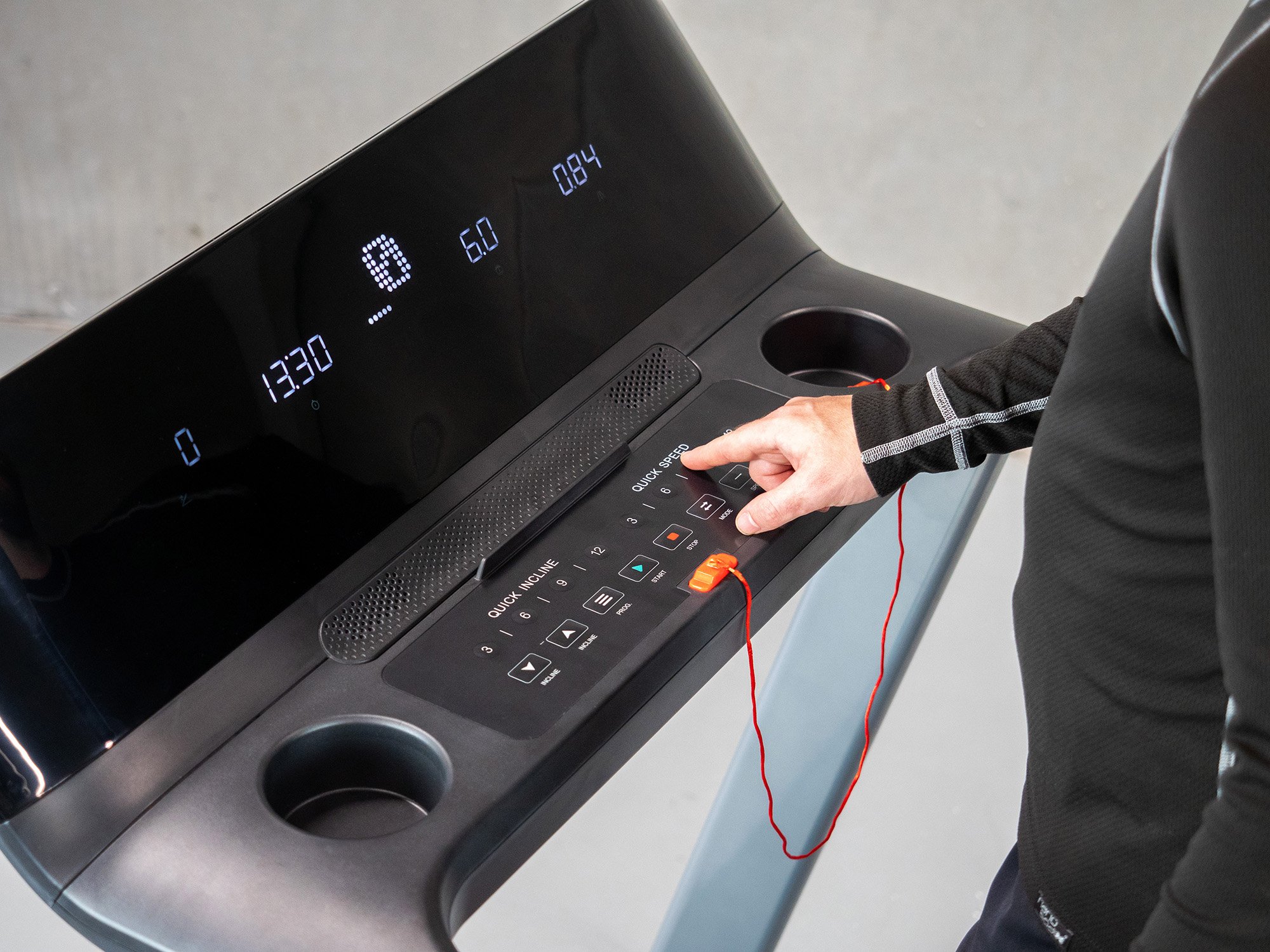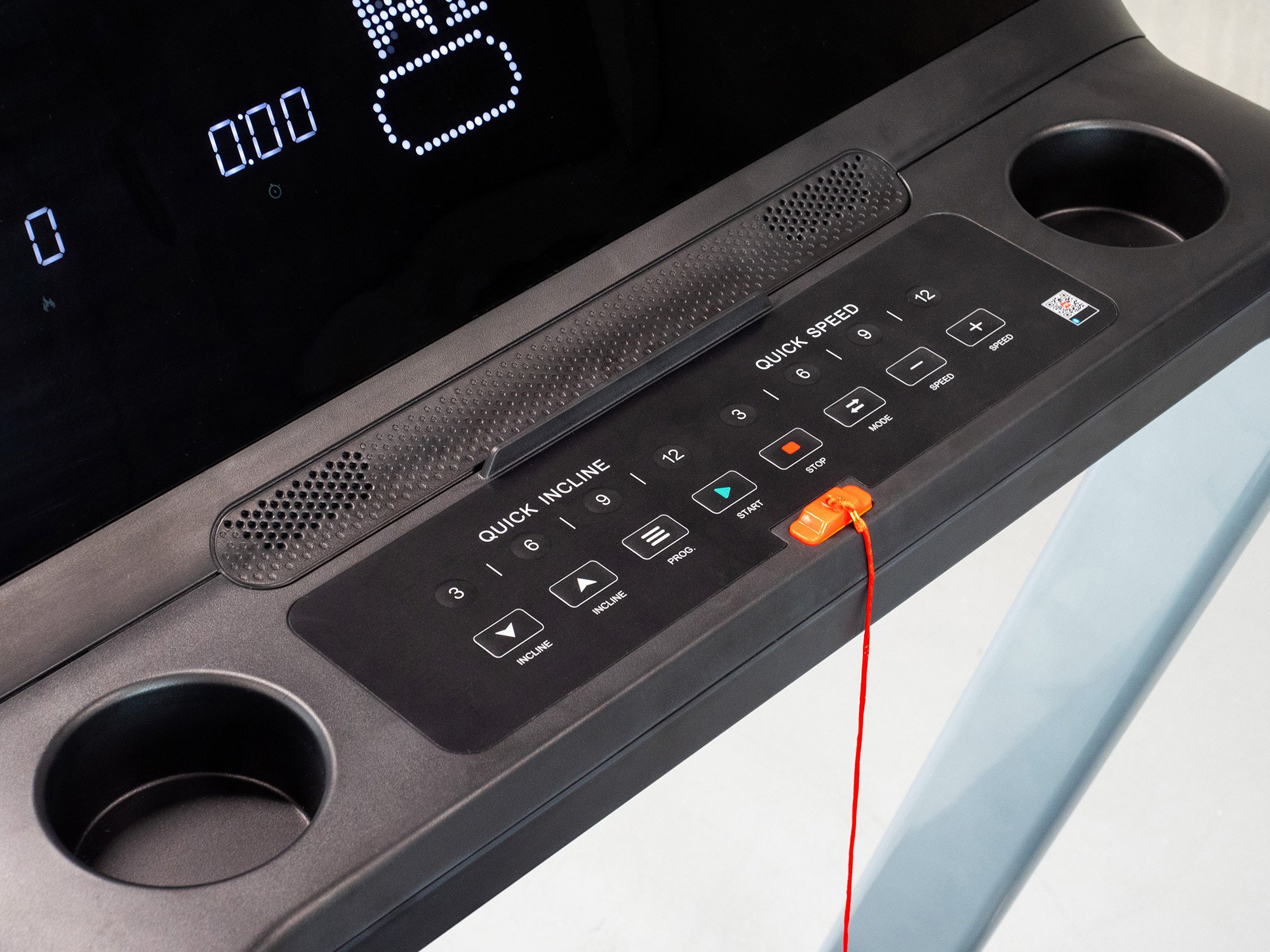 Pás je vybavený aj bezpečnostnou rýchlobrzdou, ktorá vám v prípade potreby umožní okamžite zastaviť. Sklon pásu možno elektricky nastaviť v rozsahu 0-15 % priamo z obrazovky, čo umožňuje plynulé zmeny počas behu.