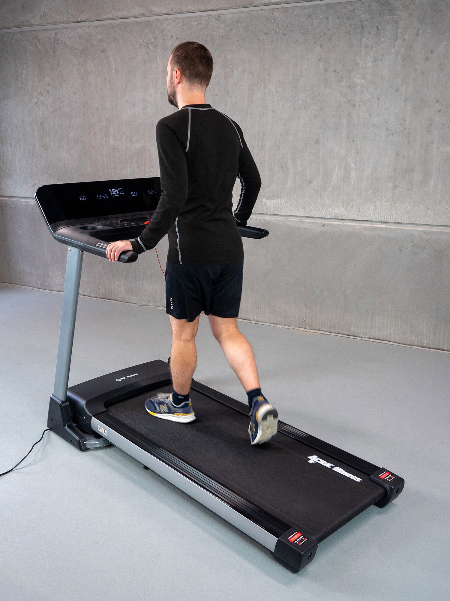 Pás je poháňaný elektromotorom s konštantnou rýchlosťou 2,0 HP a umožňuje nastavenie rýchlosti od 1 do 18 km/h. Ovládací panel je vybavený rukoväťami so snímačmi tepovej frekvencie a kontrolou záťaže.