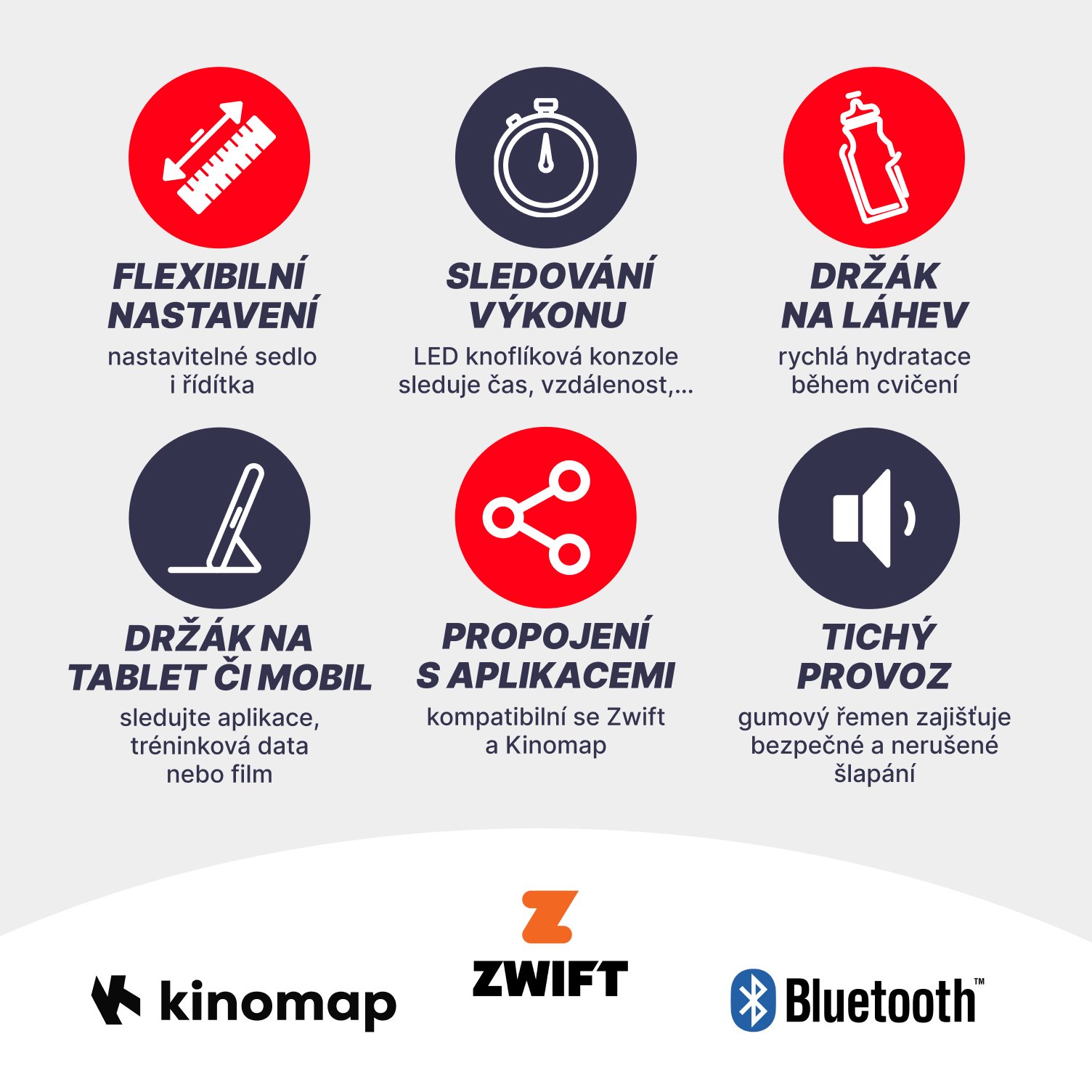 Kompatibilita s aplikáciami:Pripojenie cez Bluetooth k obľúbeným aplikáciám, ako sú Zwift a Kinomap, pre zábavnejší a interaktívnejší tréning.
