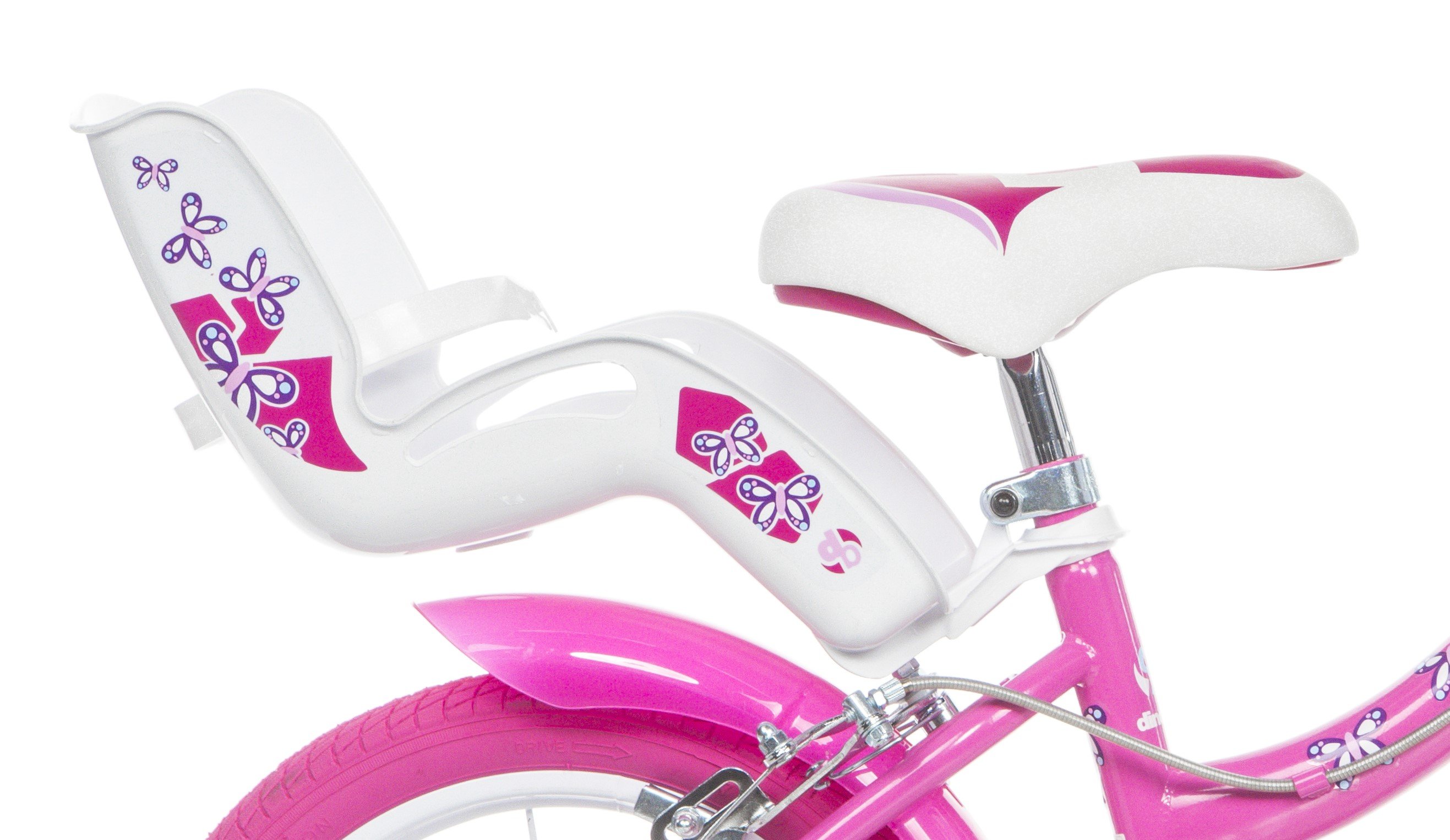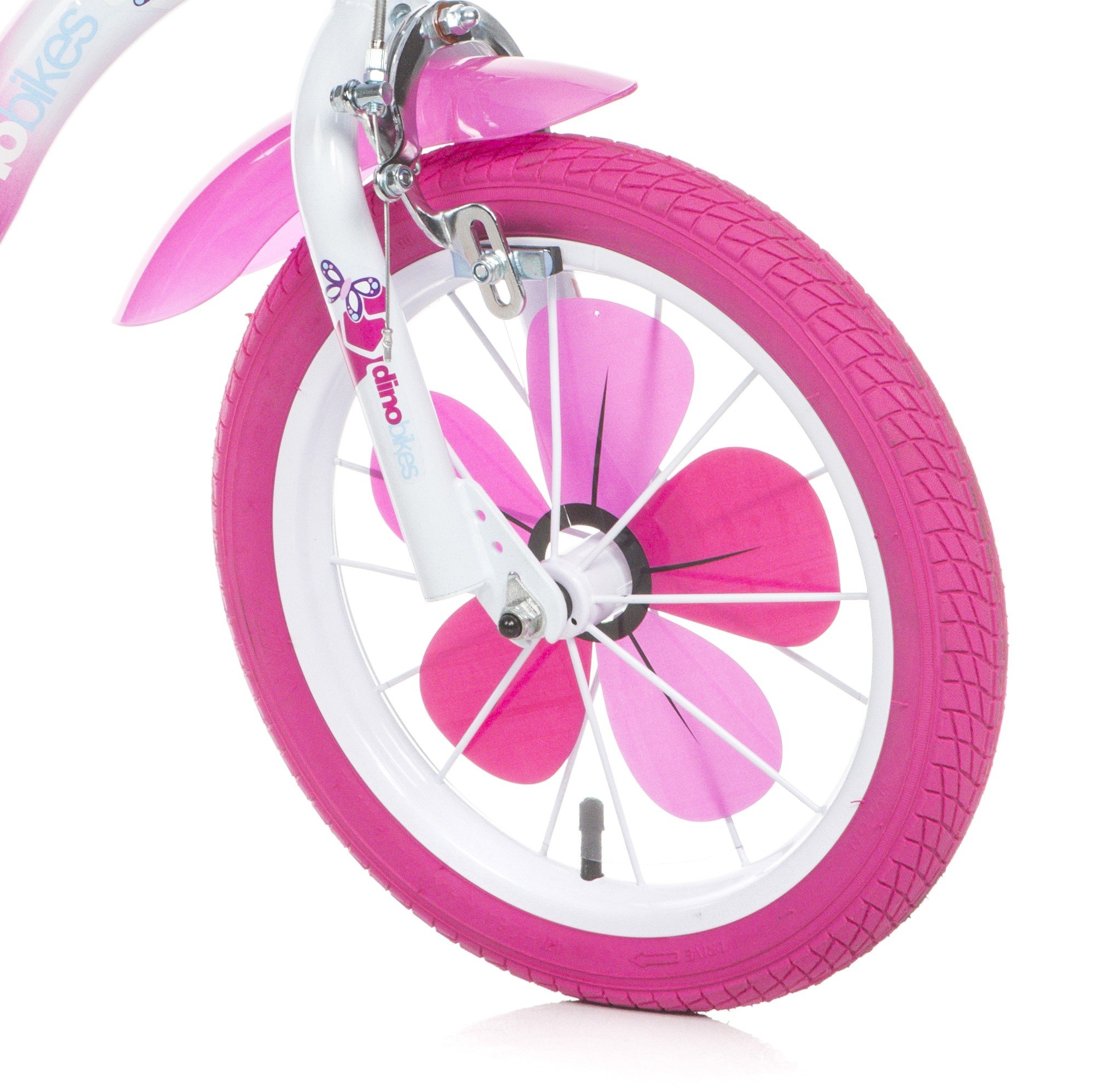 Detský bicykel Dino Bikes s potlačou FLAPPY sa vyznačuje prepracovaným dizajnom, ktorý dodáva bicyklu atraktívny vzhľad v bielej a ružovej farbe.