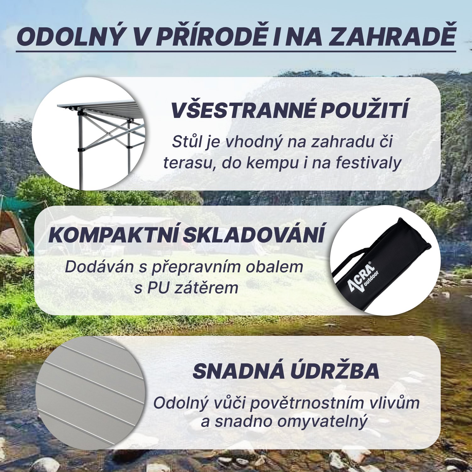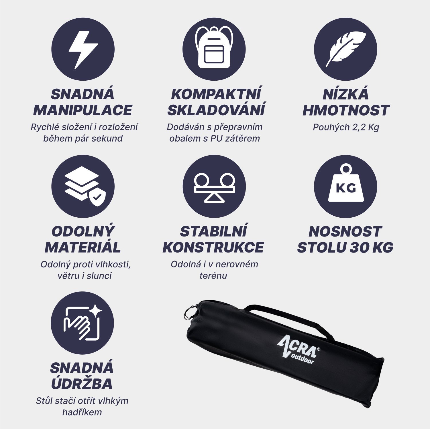 Kempingový skladací stôl Acra C3S: Všestranný pomocník do záhrady, na terasu a pri kempovaní!Hľadáte praktický a všestranný skladací stôl, ktorý vám poslúži v záhrade, na terase aj pri kempovaní? Potom je Acra C3S tou správnou voľbou! Vďaka pevnej hliníkovej konštrukcii je stôl veľmi stabilný a odolný. Hlavné výhody skladacieho stola Acra C3S: Všestranné použitie. Jednoduchá údržba: Stôl sa ľahko umýva a je odolný voči poveternostným vplyvom.Kompaktné rozmery: Skladací stôl nezaberá veľa miesta, takže ho možno ľahko uskladniť aj v menšom priestore.Nízka hmotnosť: Vďaka nízkej hmotnosti 2,2 kg sa stôl ľahko prenáša. Vysoká nosnosť. Moderný dizajn. Praktický prepravný kufor: Stôl sa dodáva s prepravným kufrom s PU povrchovou úpravou z vnútornej strany, ktorá ho chráni pred poškodením. Acra C3S je ideálnou voľbou pre každého, kto oceňuje praktický, odolný a všestranný nábytok. Vďaka nízkej cene a vysokej kvalite je skvelou investíciou, ktorá vám vydrží dlhé roky. Tip: Ak chcete ešte väčšie pohodlie, dokúpte si k stolu skladacie stoličky Acra. Technické špecifikácie: Rozmery: 70 x 70 x 70 cmHmotnosť: 2,2 kgNosnosť: 30 kgMateriál: hliníkFarba: strieborná