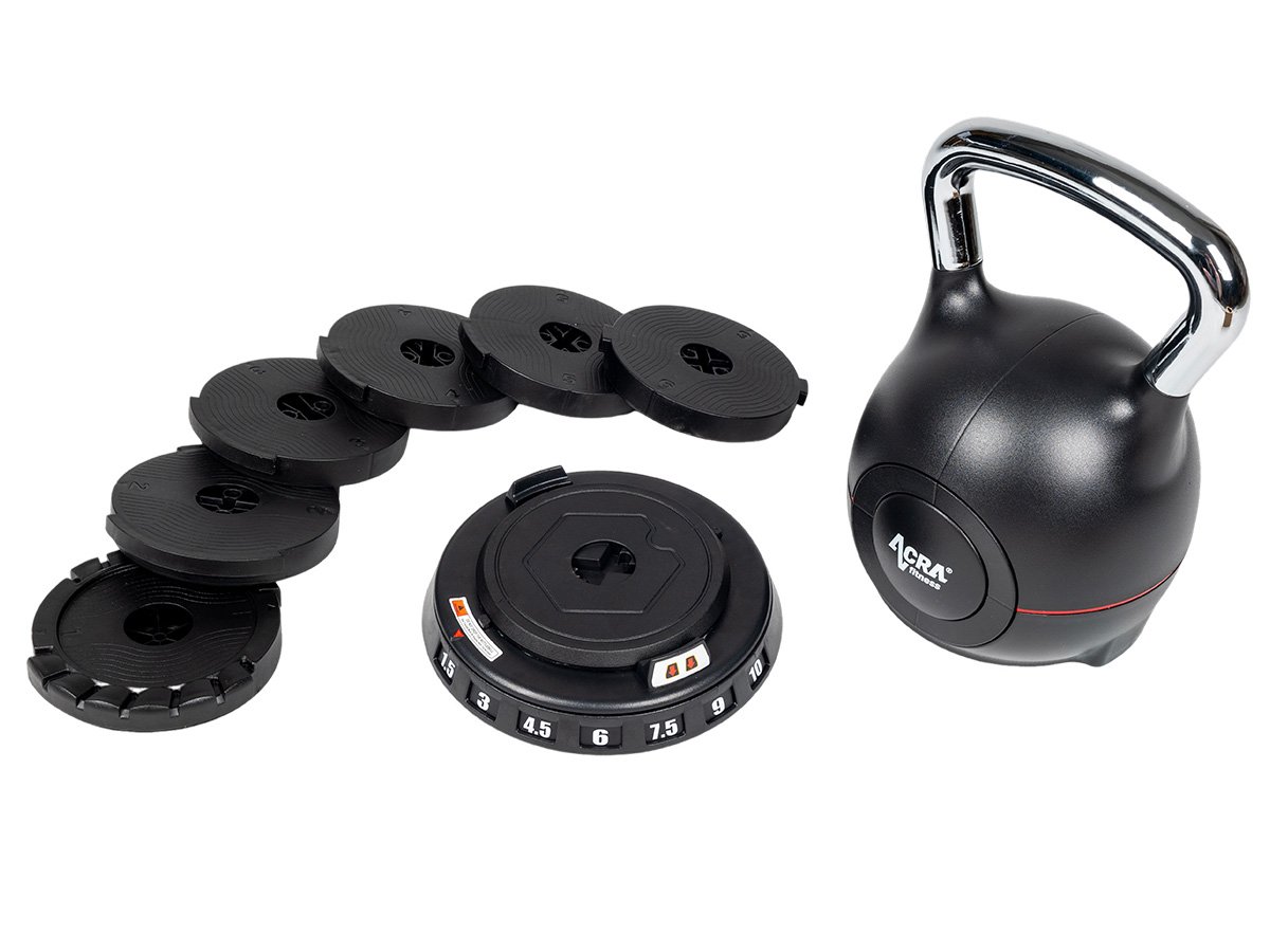 Kettlebell 7v1 Acra Fitness 1,5-10 kg - Vaša domáca posilňovňa v jednom kuse!Prečo investovať do celej sady kettlebellov, keď môžete mať všetko v jednom? Náš nastaviteľný kettlebell Acra Fitness 7v1 je revolučným riešením pre každého, kto chce cvičiť doma, ale nemá na to priestor.