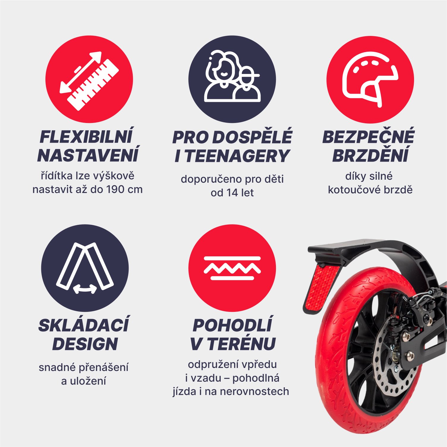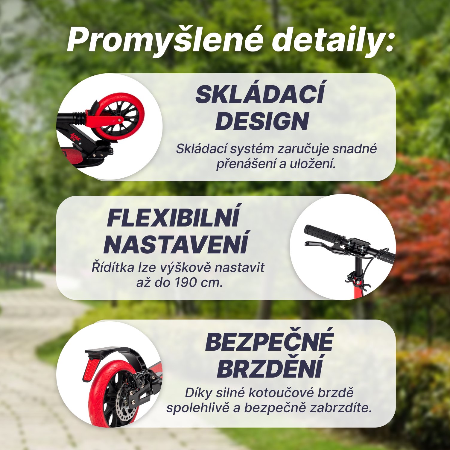 Kolobežka Acra Joy DiabloAcra Joy Diablo je rýchla, odpružená, skladacia a kompaktná kolobežka, ktorá je ideálna na jazdu po ceste a v menšom teréne. Je vhodná pre jazdcov všetkých úrovní a je ideálna na dochádzanie do práce alebo do školy, na zábavu a voľný čas a na výlety v teréne. Jednoducho ju zbaľte a prenášajte, alebo ju uložte doma či v garáži. Upozorňujeme, že nie je stvorená na skákanie a triky! Pohľad: Kolobežka má červenú a čiernu farbu. Kolieska sú vyrobené z gumy a majú pevné pneumatiky. Rám kolobežky je vyrobený z ocele a je skladací. Riadidlá kolobežky sú nastaviteľné do výšky 190 cm a majú gumové rukoväte. Kolobežka má zadnú kotúčovú brzdu. Technické vlastnosti: Nosnosť: 100 kg Odporúčaná výška jazdca: 130 až 190 cm Odporúčaný vek: 14 rokov a viac Výška riadidiel: nastaviteľná Priemer bicykla: 200 mm Podlahová plocha: 33 x 13 cm Odpruženie:áno, pod stojacou nohou Brzdy:zadné kotúčové Hmotnosť: 5,8 kg Vlastnosti: Rýchla: Vďaka ľahkej konštrukcii a veľkým kolesám je kolobežka Diablo veľmi rýchla. Opružená: Odpruženie predného a predného zadného kolesa zaisťuje pohodlnú jazdu aj na nerovnom teréne. Kotúčová brzda: Zadná kotúčová brzda poskytuje silný a spoľahlivý brzdný účinok. Skladacia: Kolobežka sa dá ľahko zložiť a prenášať. Nastaviteľné riadidlá: Riadidlá možno nastaviť do výšky vhodnej pre jazdcov s rôznou výškou až do 190 cm Vhodná pre: Deti a dospelí od 14 rokov Začiatočníci a pokročilí jazdci Jízda na ceste a v menšom teréne Dochádzanie do práce alebo do školy Na zábavu a voľný čas
