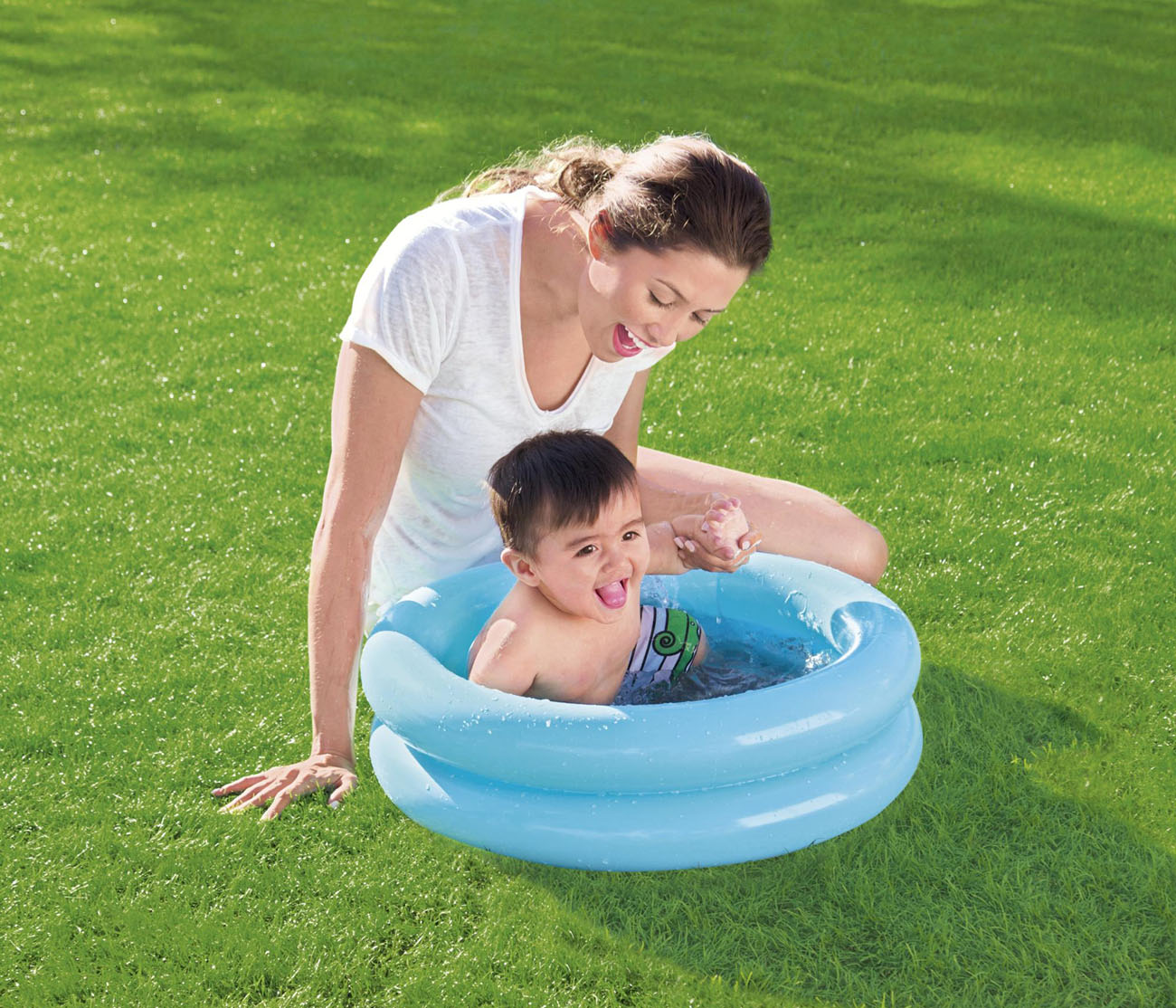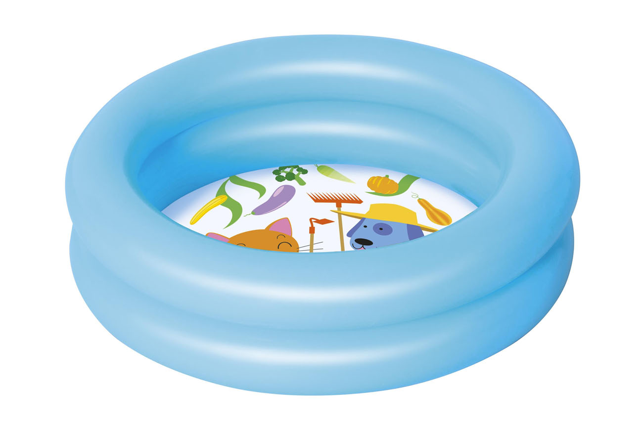 Nafukovací bazén malý dvojkomorový, 61 x 15 cm, vhodný pre deti do troch rokov, objem vody (75 %) 21 l. K dispozícii sú dve farby - modrá, ružová + spodná časť s potlačou.