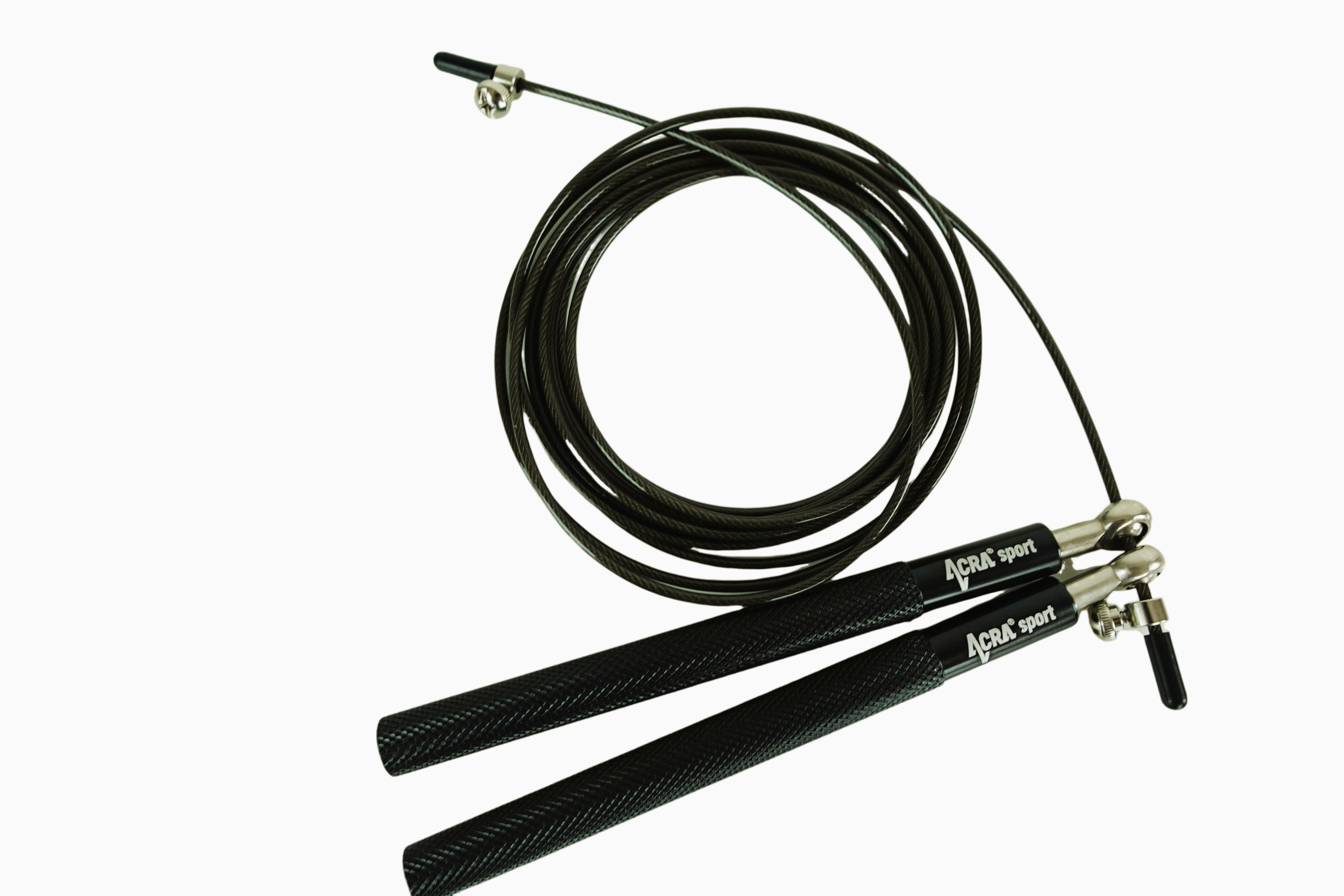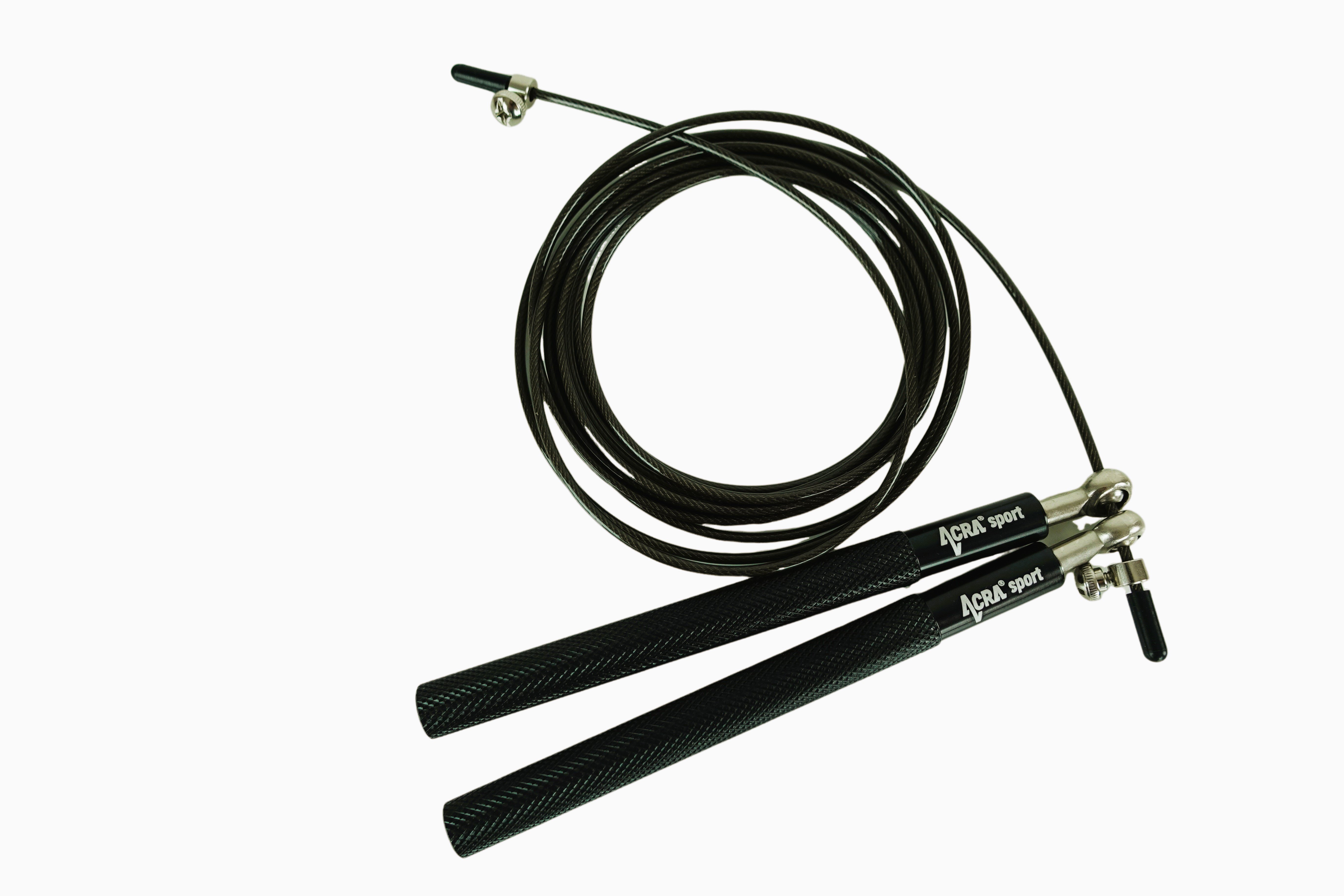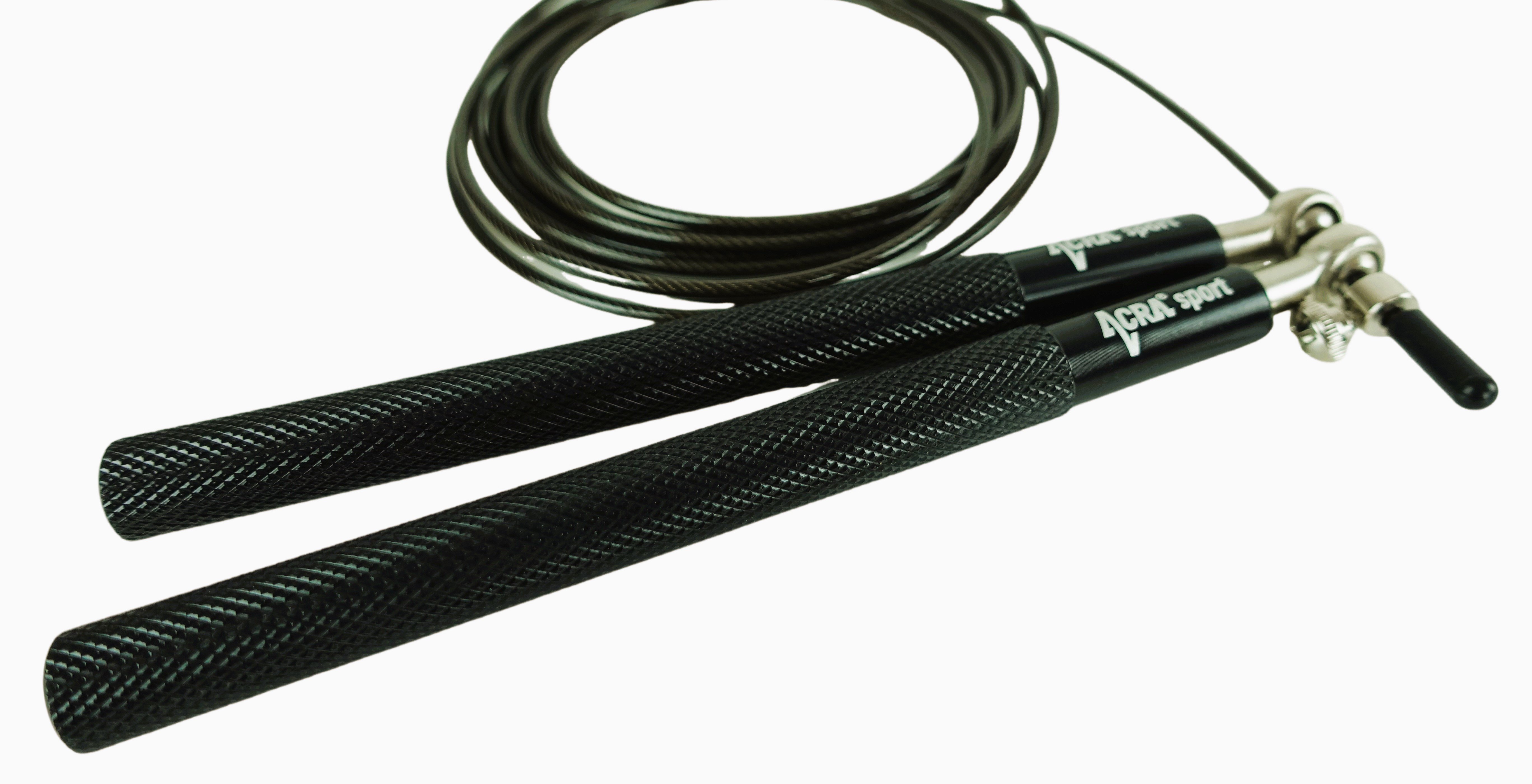 Acra Black Skipy je vynikajúci cvičebný nástroj na zlepšenie celkovej kondície. Rukoväte, ktoré sú vyrobené z pevného hliníka, majú protišmykový povrch, čo zaručuje bezpečné a pohodlné nosenie. Kovové otočné ložiská s uťahovacou skrutkou umožňujú jednoduché nastavenie dĺžky lana podľa potreby. Samotná šnúra má oceľové jadro chránené gumovým lankom a je zakončená gumovými odnímateľnými objímkami, ktoré umožňujú presné skrátenie švihadla.