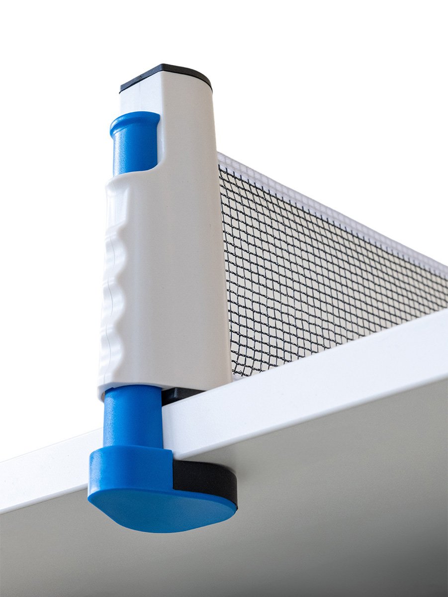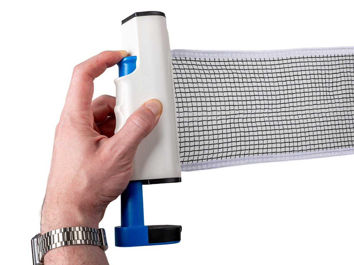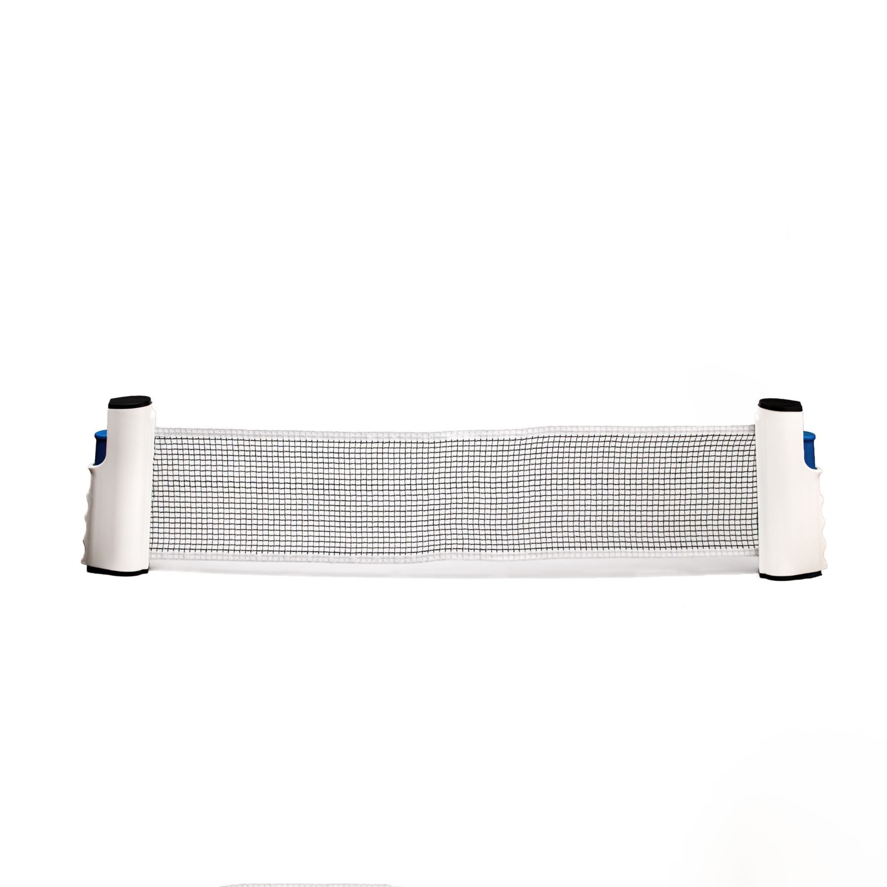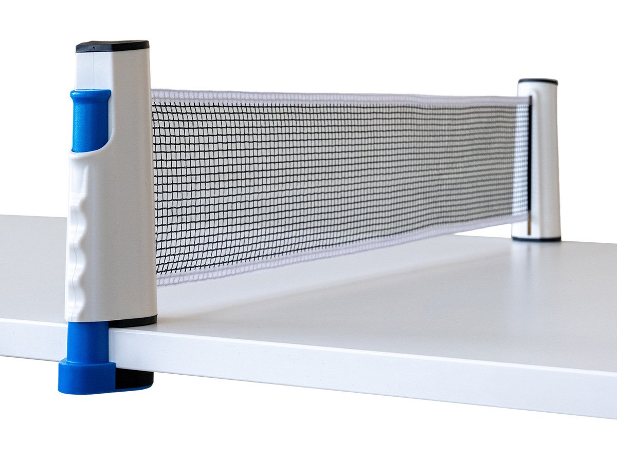 Kľúčové vlastnosti:Dizajn sťahovacej siete (sťahovací mechanizmus): Sieť je vybavená dômyselným vysúvacím mechanizmom, ktorý umožňuje jednoduché a rýchle nastavenie. Stačí pripevniť svorky k okraju stola a sieť sa automaticky roztiahne na požadovanú dĺžku (až do šírky stola, pravdepodobne okolo 180 cm). Po skončení hry sieť rovnako ľahko stiahnete a vyčistíte.Univerzálna kompatibilita: Vďaka rozťahovacej konštrukcii sa sieť hodí na väčšinu štandardných stolov. Nie je potrebné mať špeciálny pingpongový stôl. (Stoly s maximálnou hrúbkou dosky približne 5 cm a šírkou do 180 cm).Kompaktná a prenosná: Po vybratí sa sieťka a rukoväte zložia do kompaktnej veľkosti, čo umožňuje jednoduché skladovanie a prenášanie. Súprava je ideálna na cestovanie a spontánne hry.Pevné pripevnenie:Robustné svorky s protišmykovou úpravou zabezpečujú pevné a stabilné pripevnenie sieťky k okraju stola, takže sa nemusíte obávať jej posunu počas hry.Moderný bielo-modrý dizajn: Sieťka je k dispozícii v atraktívnej bielo-modrej farebnej kombinácii, ktorá dodáva súprave svieži a športový vzhľad.