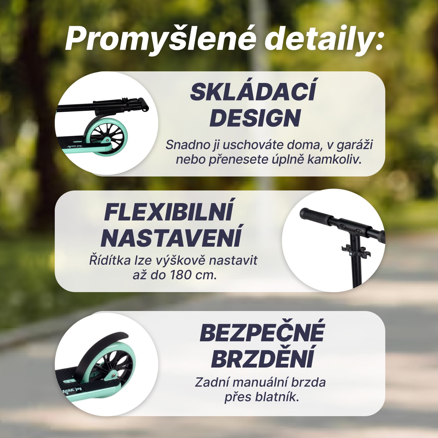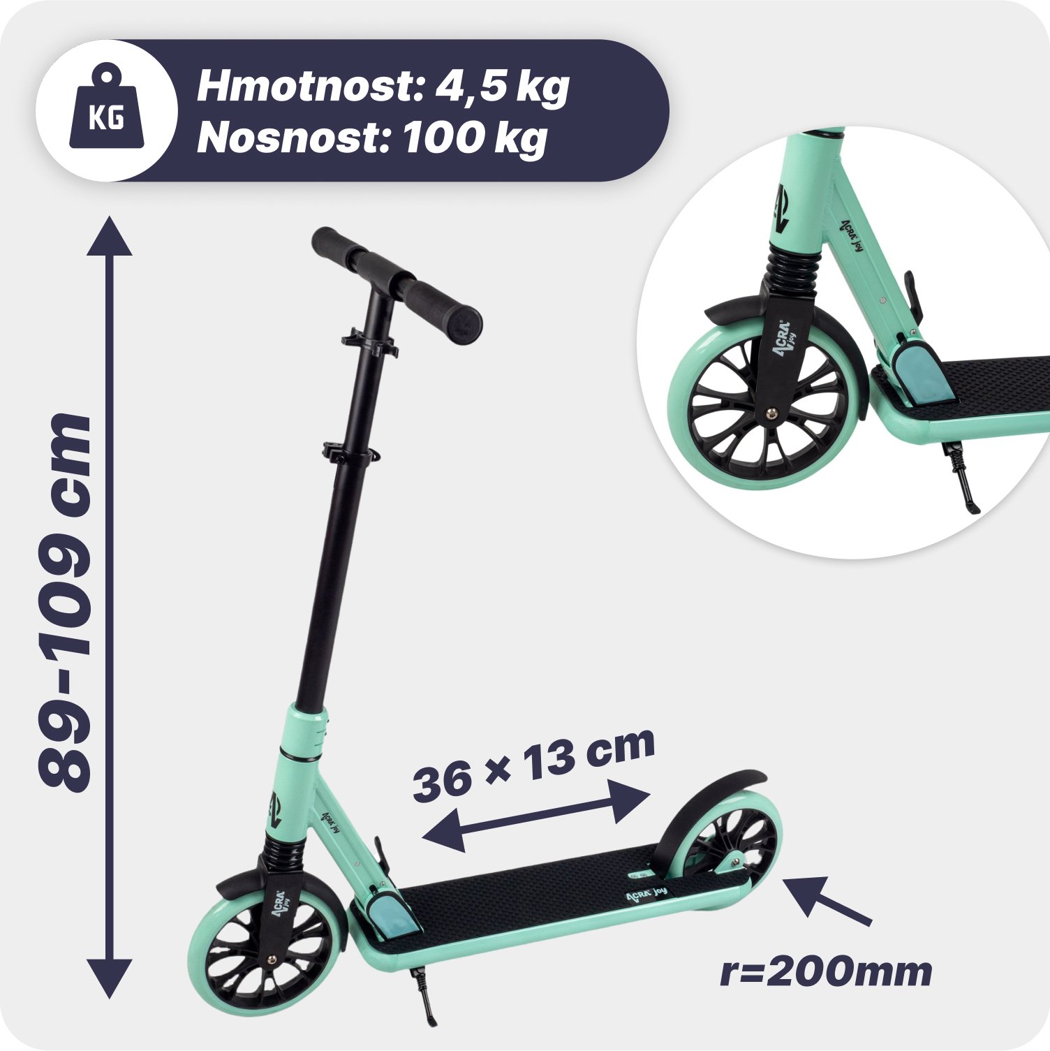 Kolobežka Acra Joy NimbleAcra Joy Nimble je rýchla, odpružená, skladacia a kompaktná kolobežka nielen pre malých jazdcov. Je ideálna na jazdu na ceste a v menšom teréne. Je vhodná pre jazdcov všetkých úrovní a je ideálna na dochádzanie do práce alebo do školy, na zábavu a voľný čas a na výlety v teréne. Jednoducho ju zbaľte a prenášajte alebo ju uložte doma či v garáži. Upozornenie, nie je stvorená na skákanie a triky! Pohľad: Kolobežka je čiernej a svetlomodrej farby. Kolieska sú vyrobené z gumy a majú pevné pneumatiky. Rám kolobežky je vyrobený z ľahkej odľahčenej ocele a je skladací. Riadidlá kolobežky sú nastaviteľné až do 180 cm a majú gumové sklopné rukoväte. Kolobežka sa brzdí zadnou nohou - cez blatník Technické vlastnosti: Nosnosť kolobežky: 100 kg Odporúčaná výška jazdca: 110 až 180 cm Odporúčaný vek: 9 až 16 rokov Výška odnímateľných riadidiel: nastaviteľná Priemer kolies: 200 mm Plocha obloženia: 36 x 13 cm Odpruženie: áno, pod stojacou nohou Brzda: Vďaka svojej ľahkej konštrukcii a veľkým kolesám je kolobežka Nimble veľmi rýchla. Opruženie: Odpruženie predného kolesa zabezpečuje pohodlnú jazdu aj na nerovnom teréne. Brzda: Nimbal je vybavený brzdou, ktorá je súčasťou balančného systému: Zadná brzda nad blatníkom - manuálna zabezpečuje spoľahlivý brzdný účinok. Skladacia. Nastaviteľné riadidlá: Riadidlá možno nastaviť do výšky vhodnej pre jazdcov rôznej výšky až do 180 cm Vhodné pre:Deti a dospelých vo veku od 9 do 16 rokov Začiatočníkov a pokročilých jazdcov Jedenie na ceste a v menšom teréne Dochádzanie do práce alebo do školy Na zábavu a voľný čas