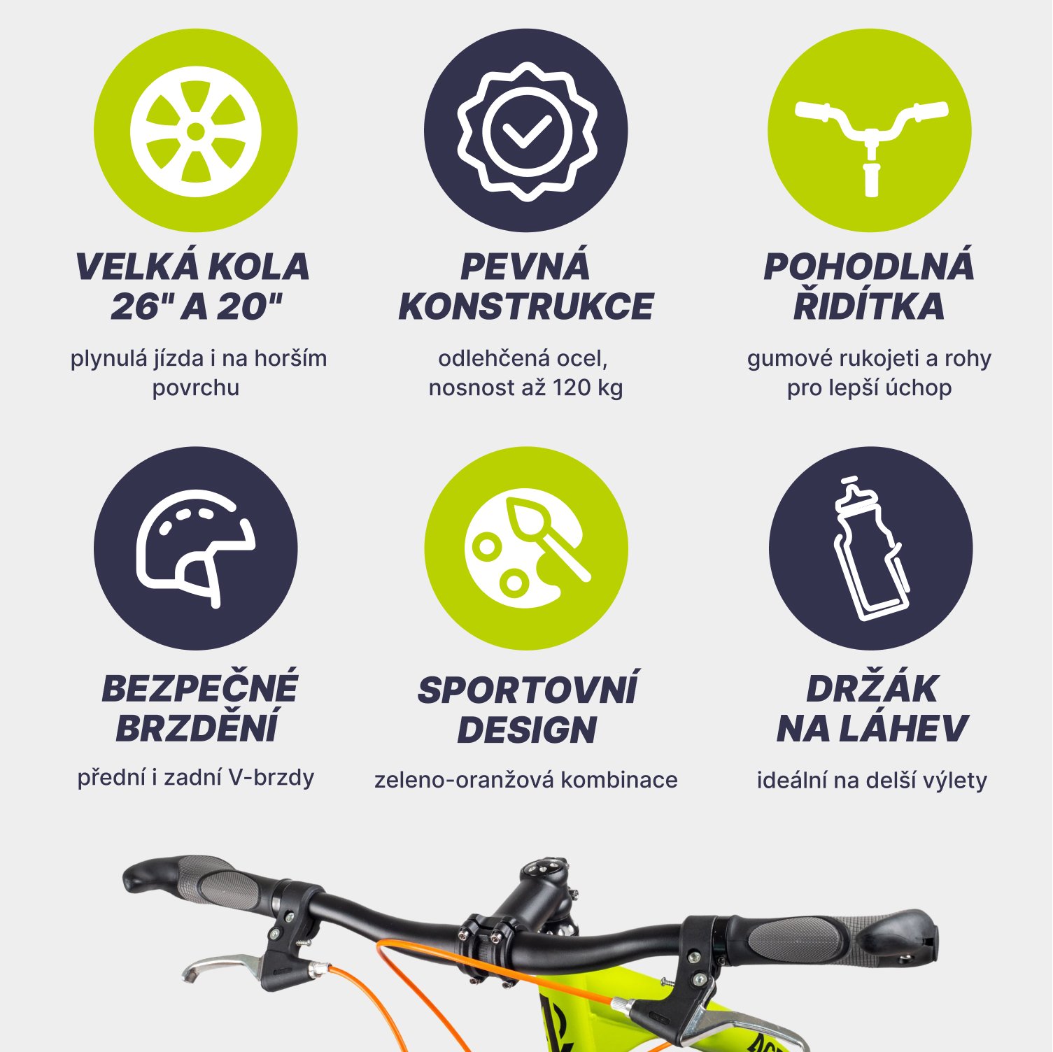 Riadidlá kolobežky sú robustné, odporúčané do výšky 190 cm a majú gumové rukoväte a rohy na riadidlách