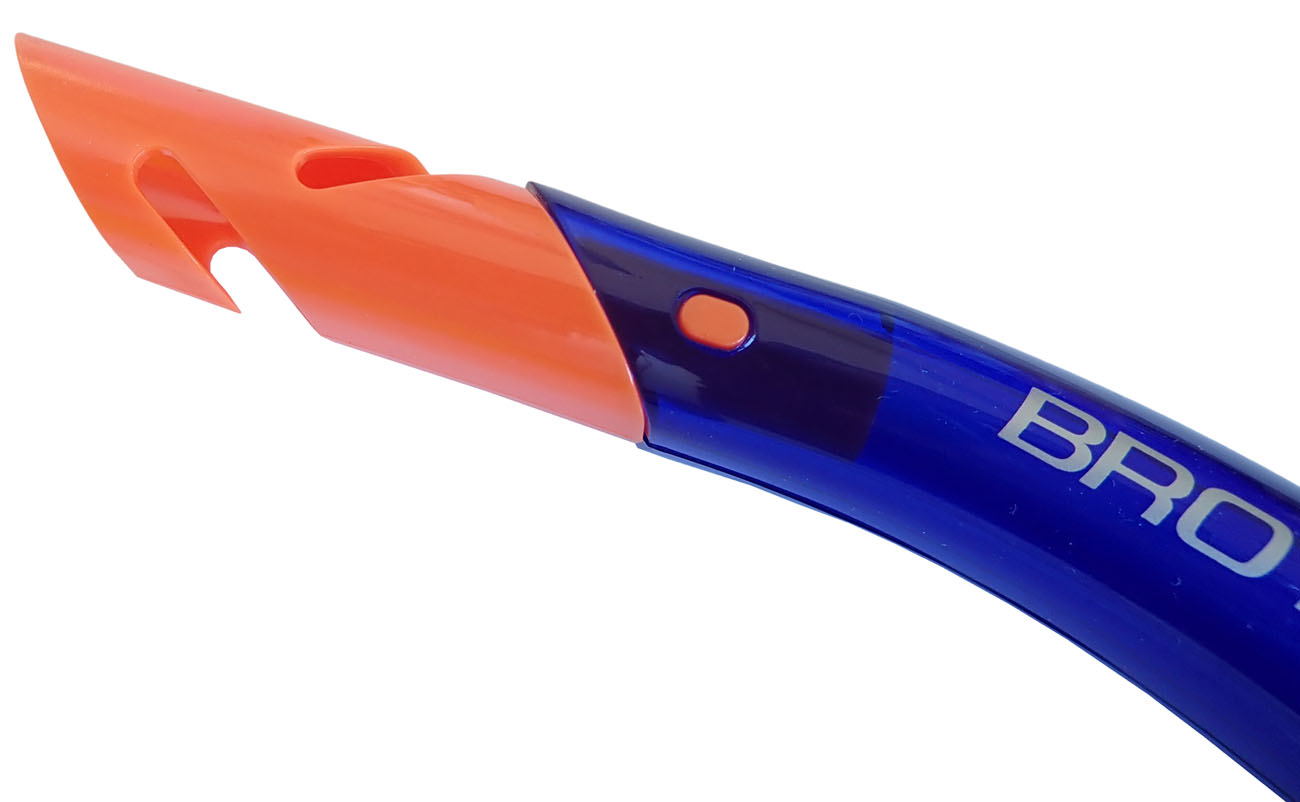 Šnorchel s vypúšťacím ventilom a vodotesným uzáverom - balenie v blistri, s vrchným vodotesným uzáverom a výfukom. Materiál - silikón + polyetylén.