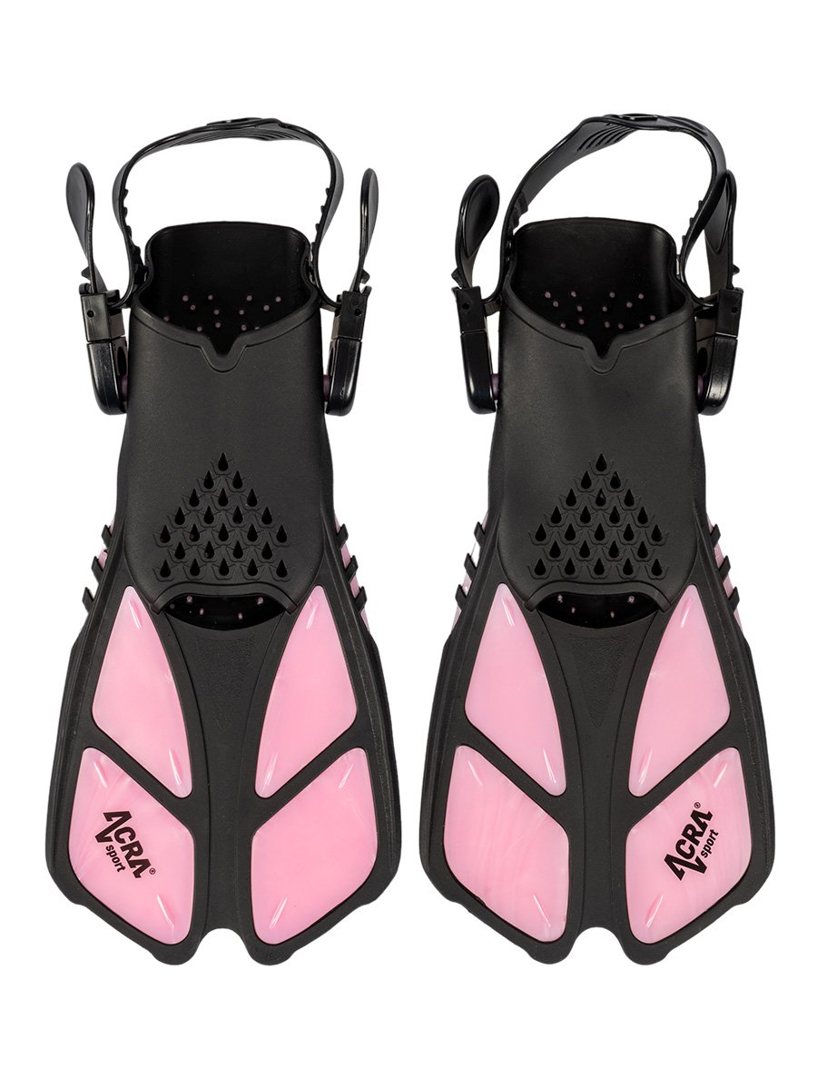 Detská sada na šnorchlovanie Acra sport obsahuje: nastaviteľné detské plutvy, suchý šnorchel, plaveckú masku.