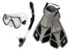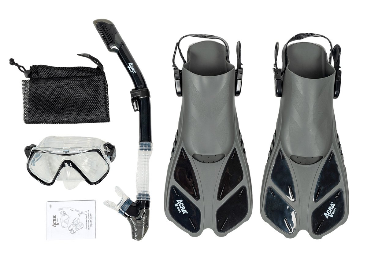 Šnorchlovacia súprava Acra Sport s nastaviteľnými plutvami, maska z tvrdeného skla s dvoma priezormi, silikónový šnorchel Dry Top a cestovná taška na vybavenie. Súprava šnorchlov Acra je dokonalým spoločníkom na cesty a je vhodná na šnorchlovanie, plávanie, potápanie a mnoho ďalšieho.