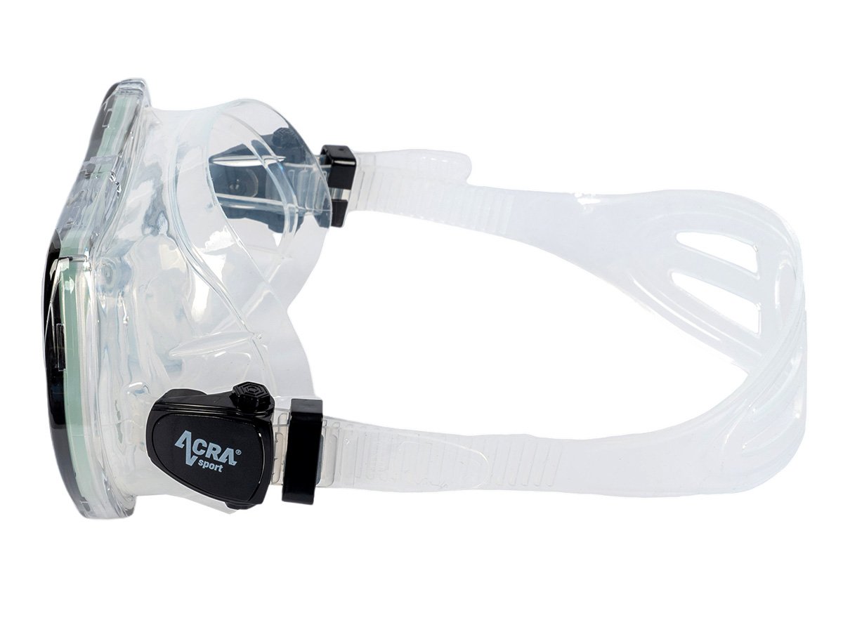 Šnorchlovacia maska s panoramatickým výhľadom: 180° panoramatický pohľad v HD rozlíšení. Šnorchlovacia maska Acra Sport, vyrobená zo štyroch okien s panoramatickým výhľadom, so zorníkom z tvrdeného skla a hypoalergénnou silikónovou vložkou, odoláva tlaku pod vodou pri potápaní a šnorchlovaní a ponúka maximálne pohodlie. Lem šnorchlovacej masky je vyrobený z mäkkého a pružného silikónu a náustok z potravinárskeho silikónu je bezpečný, vytvára vodotesné spojenie s tvárou každého vodiča a dokonale prilieha k ústam bez zvláštneho zápachu.