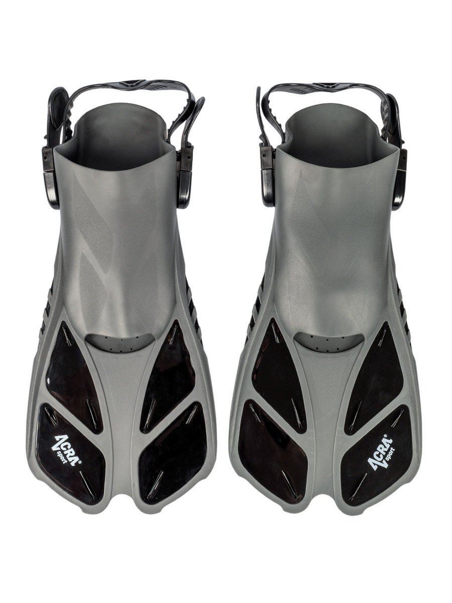 Pružné nastaviteľné potápačské plutvy: Dlhšia, ľahká a citlivá čepeľ poskytuje hladký, ľahký a zároveň silný odraz. Plutvy s otvorenou pätou a nastaviteľným remienkom, vrecko na nohu a remienok sú vyrobené z odolnej gumy, ktorá zaručuje pohodlné nosenie. Plutva Acra Sport poskytuje vynikajúcu trakciu s miernou silou kopania, ktorá je ideálna na vaše šnorchlovanie alebo potápanie.