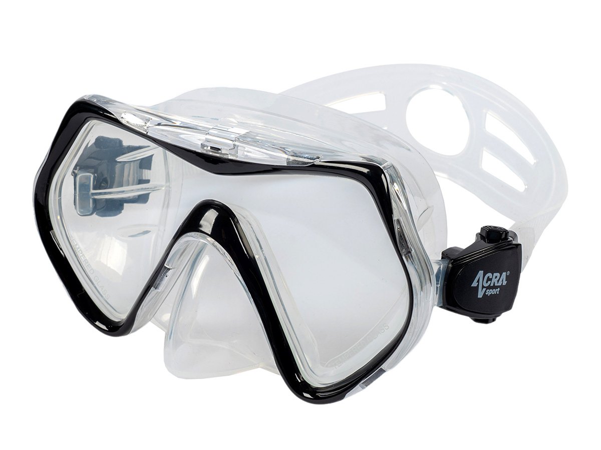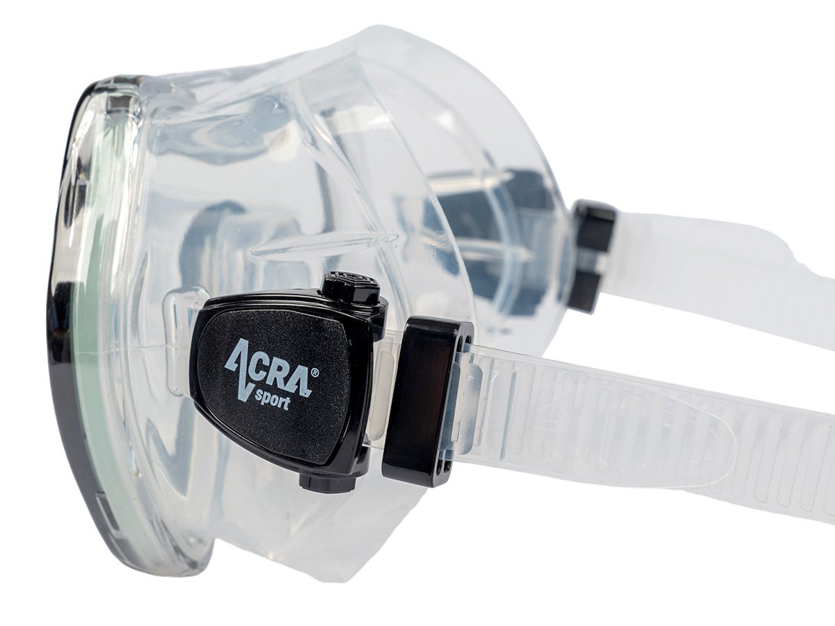 Šnorchlovacia maska s panoramatickým výhľadom: 180° panoramatický pohľad v HD rozlíšení. Šnorchlovacia maska Acra Sport, vyrobená zo štyroch okien s panoramatickým výhľadom, so zorníkom z tvrdeného skla a hypoalergénnou silikónovou vložkou, odoláva tlaku pod vodou pri potápaní a šnorchlovaní a ponúka maximálne pohodlie. Lem šnorchlovacej masky je vyrobený z mäkkého a pružného silikónu a náustok z potravinárskeho silikónu je bezpečný, vytvára vodotesné spojenie s tvárou každého vodiča a dokonale prilieha k ústam bez zvláštneho zápachu.