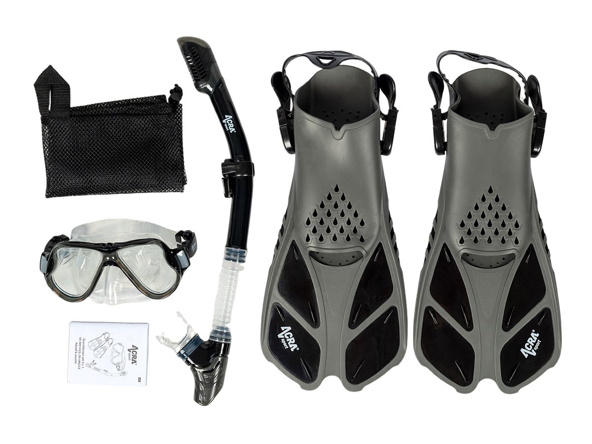 Sada na šnorchlovanie Acra Sport s nastaviteľnými plutvami, maska z tvrdeného skla s dvoma priezormi, silikónový šnorchel Dry Top a cestovná taška na vybavenie. Súprava šnorchlov Acra je dokonalým spoločníkom na cesty a je vhodná na šnorchlovanie, plávanie, potápanie a mnoho ďalšieho.
