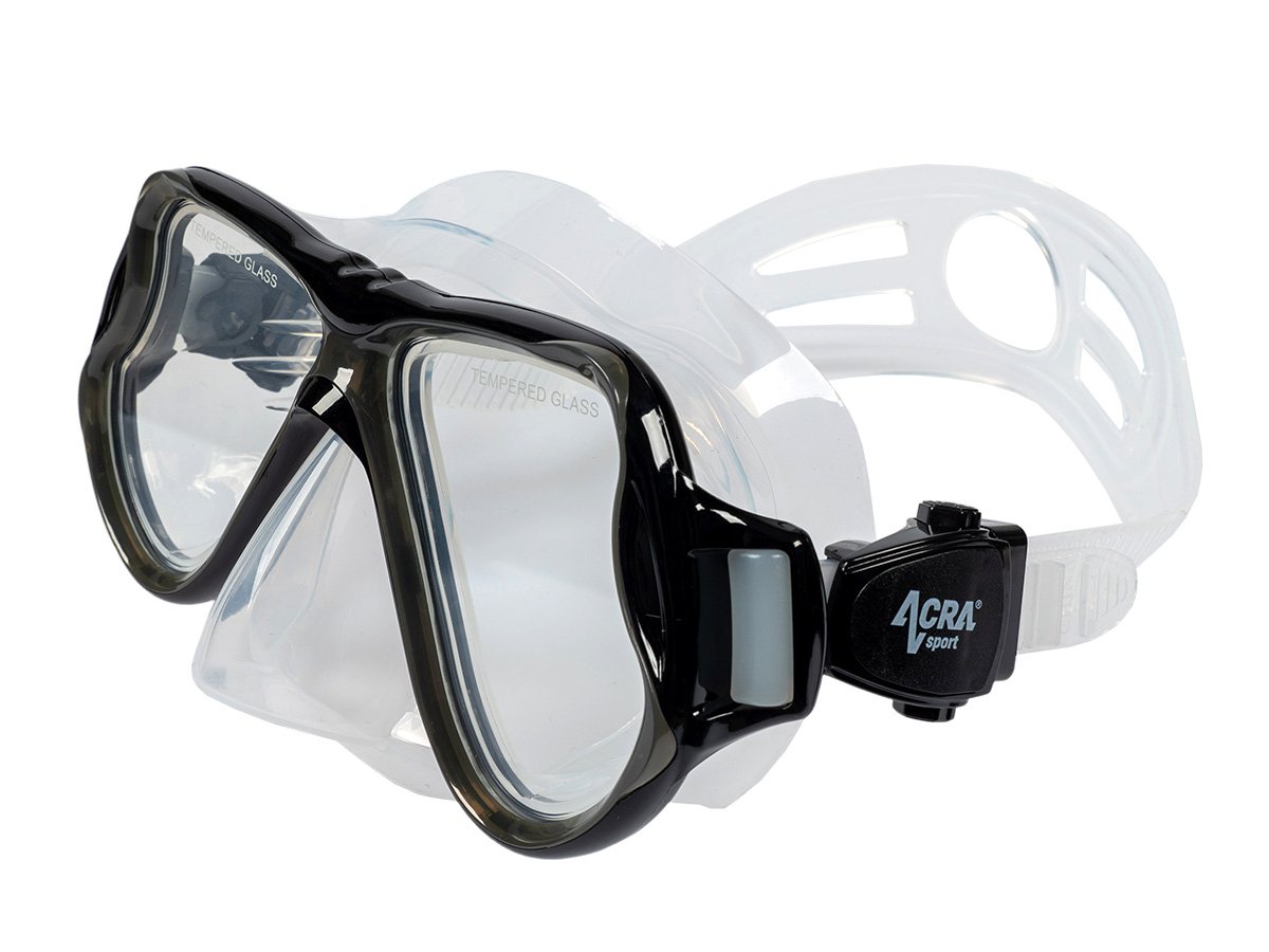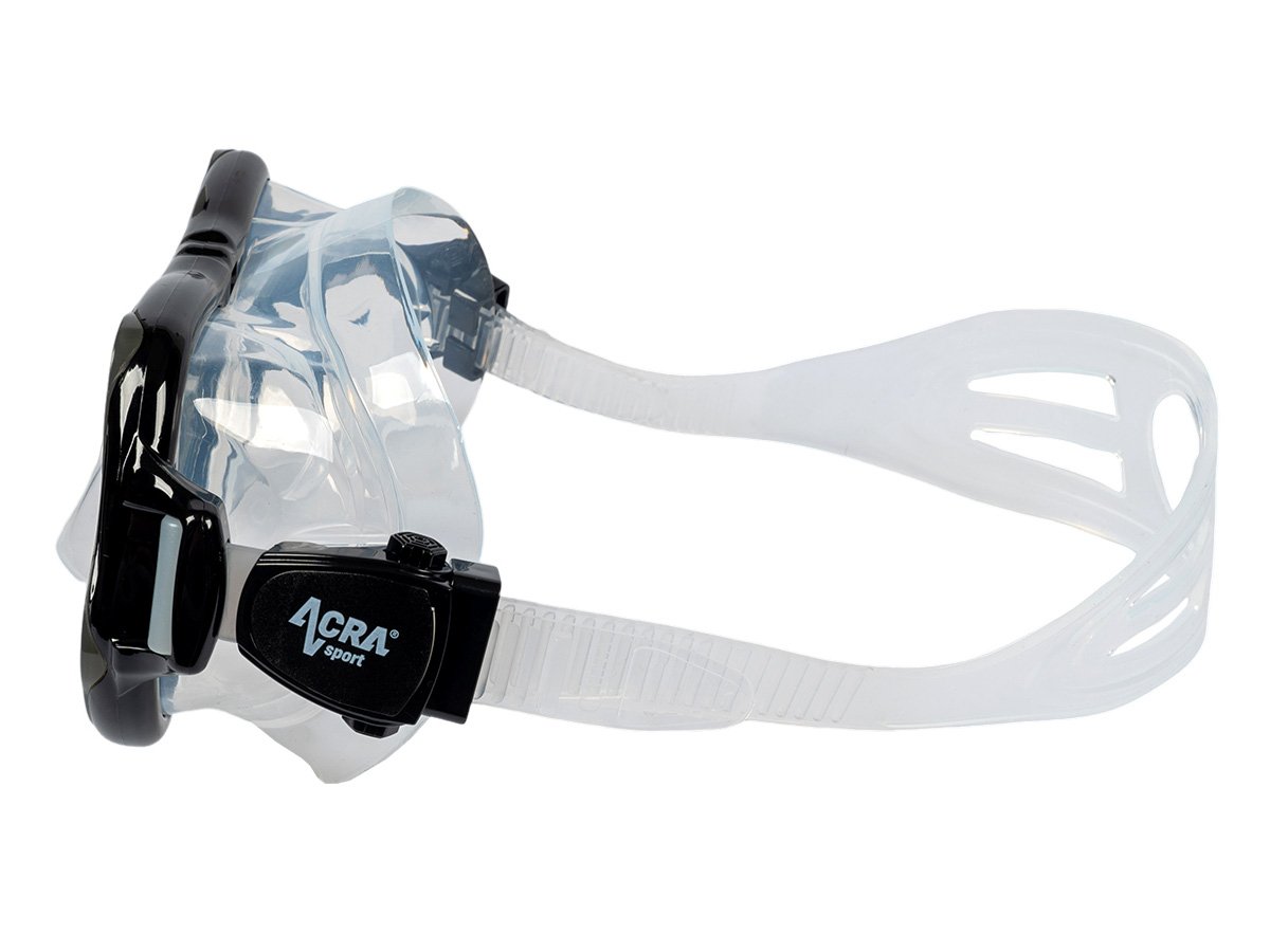 Maska na šnorchlovanie s panoramatickým výhľadom: 180° HD panoramatický pohľad s úpravou ANTIFOG. Šnorchlovacia maska Acra Sport, vyrobená zo štyroch okien s panoramatickým výhľadom, so šošovkou z tvrdeného skla a hypoalergénnou silikónovou vložkou, odoláva tlaku pod vodou pri potápaní a šnorchlovaní a ponúka maximálne pohodlie. Lem potápačskej masky je vyrobený z mäkkého a pružného silikónu a náustok z potravinárskeho silikónu je bezpečný, vytvára vodotesné spojenie s tvárou každého vodiča a dokonale sa pripevňuje k ústam bez zvláštneho zápachu.