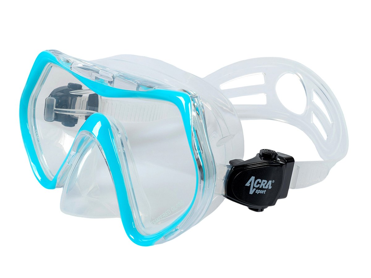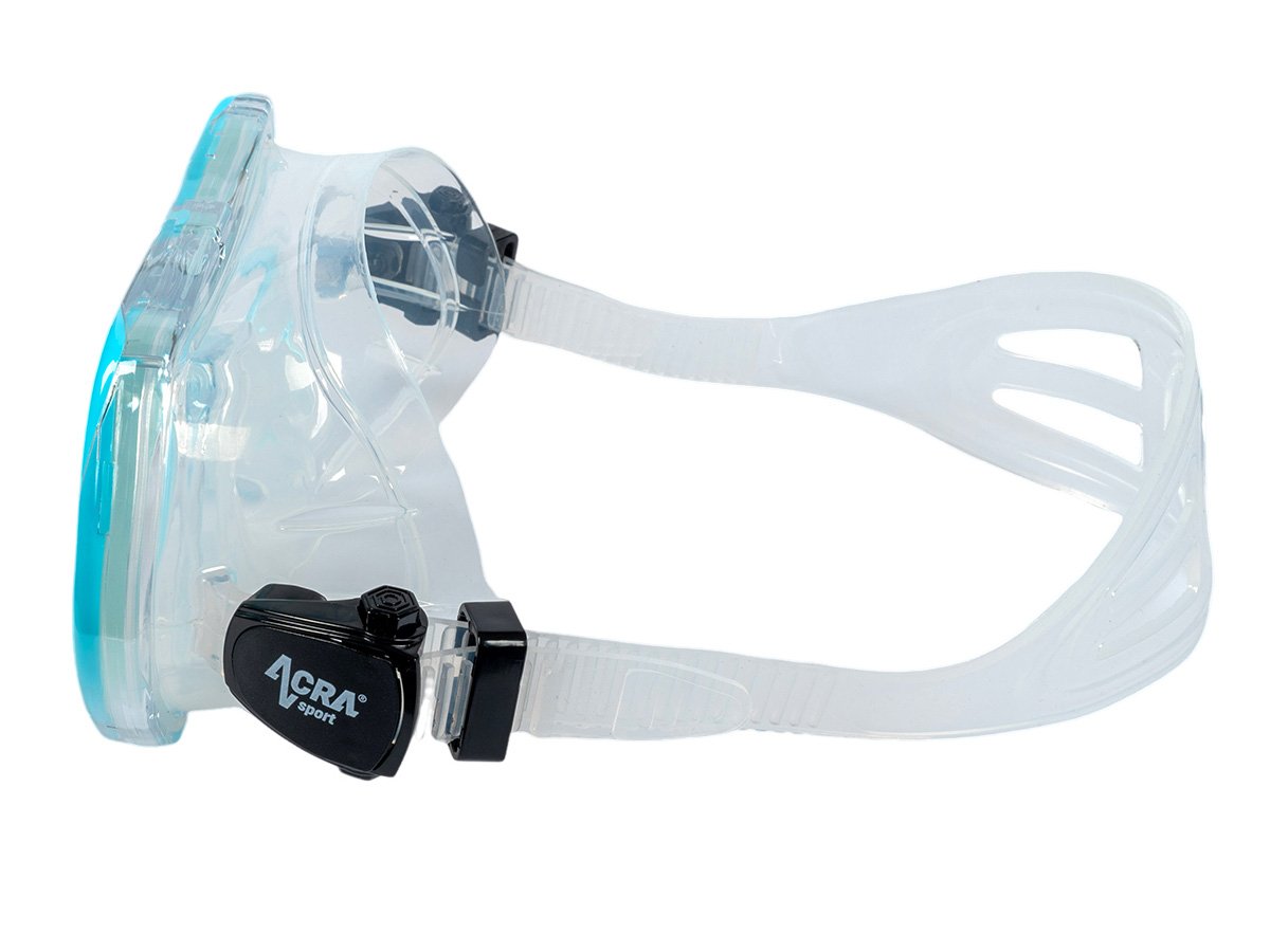 Šnorchlovacia maska s panoramatickým výhľadom: 180° panoramatický pohľad v HD rozlíšení. Šnorchlovacia maska Acra Sport, vyrobená zo štyroch okien s panoramatickým výhľadom, so zorníkom z tvrdeného skla a hypoalergénnou silikónovou vložkou, odoláva tlaku pod vodou pri potápaní a šnorchlovaní a ponúka maximálne pohodlie. Lem šnorchlovacej masky je vyrobený z mäkkého a pružného silikónu a náustok z potravinárskeho silikónu je bezpečný, vytvára vodotesné spojenie s tvárou každého vodiča a dokonale prilieha k ústam bez zvláštneho zápachu.
