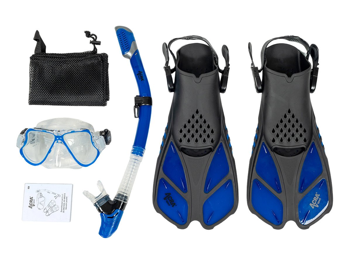 Sada na šnorchlovanie Acra Sport s nastaviteľnými plutvami, maska z tvrdeného skla s dvoma priezormi, silikónový šnorchel Dry Top a cestovná taška na vybavenie. Súprava šnorchlov Acra je dokonalým spoločníkom na cesty a je vhodná na šnorchlovanie, plávanie, potápanie a mnoho ďalšieho.
