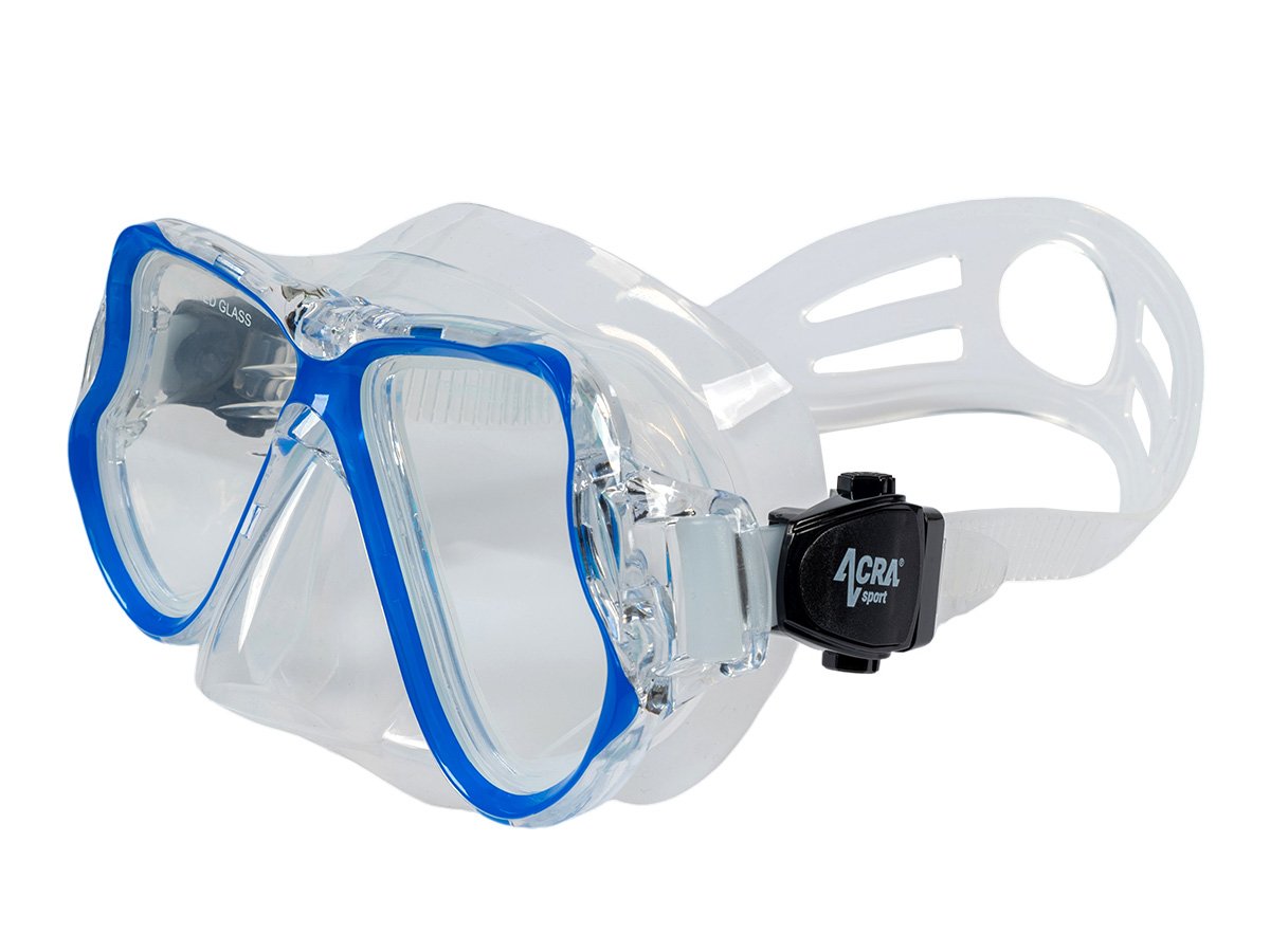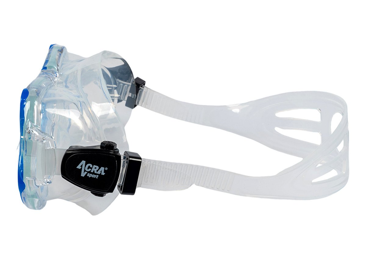 Maska na šnorchlovanie s panoramatickým výhľadom: 180° HD panoramatický pohľad s úpravou ANTIFOG. Šnorchlovacia maska Acra Sport, vyrobená zo štyroch okien s panoramatickým výhľadom, so šošovkou z tvrdeného skla a hypoalergénnou silikónovou vložkou, odoláva tlaku pod vodou pri potápaní a šnorchlovaní a ponúka maximálne pohodlie. Lem potápačskej masky je vyrobený z mäkkého a pružného silikónu a náustok z potravinárskeho silikónu je bezpečný, vytvára vodotesné spojenie s tvárou každého vodiča a dokonale sa pripevňuje k ústam bez zvláštneho zápachu.