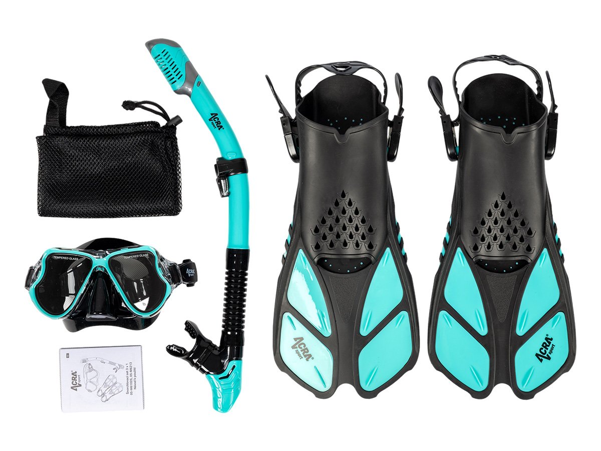 Šnorchlovacia súprava Acra Sport s nastaviteľnými plutvami, maska z tvrdeného skla s dvoma priezormi, silikónový šnorchel Dry Top a cestovná taška na vybavenie. Súprava šnorchlov Acra je dokonalým spoločníkom na cesty a je vhodná na šnorchlovanie, plávanie, potápanie a mnoho ďalšieho.