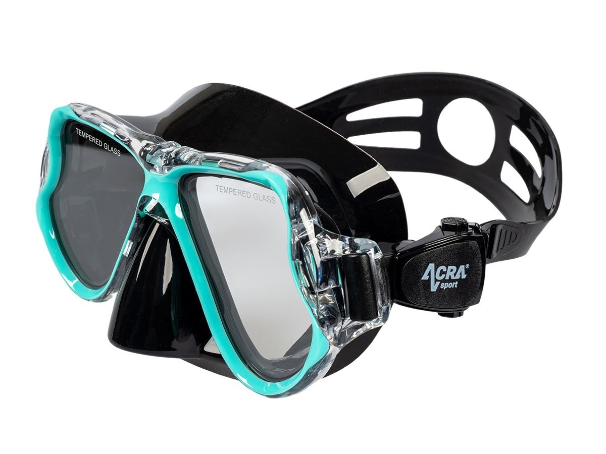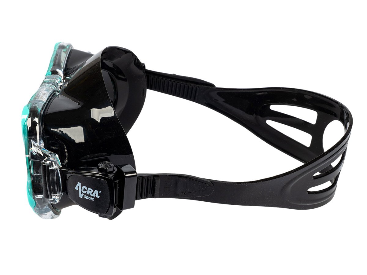 Maska na šnorchlovanie s panoramatickým výhľadom: 180° HD panoramatický pohľad s úpravou ANTIFOG. Šnorchlovacia maska Acra Sport, vyrobená zo štyroch okien s panoramatickým výhľadom, so šošovkou z tvrdeného skla a hypoalergénnou silikónovou vložkou, odoláva tlaku pod vodou pri potápaní a šnorchlovaní a ponúka maximálne pohodlie. Lem potápačskej masky je vyrobený z mäkkého a pružného silikónu a náustok z potravinárskeho silikónu je bezpečný, vytvára vodotesné spojenie s tvárou každého vodiča a dokonale sa pripevňuje k ústam bez zvláštneho zápachu.