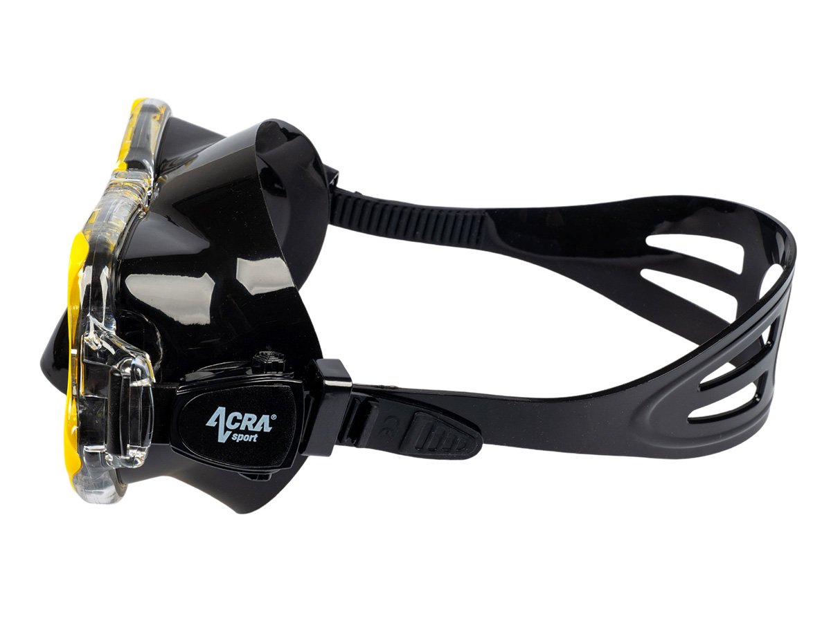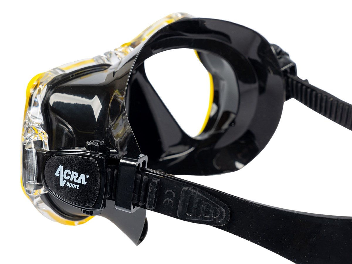 Maska na šnorchlovanie s panoramatickým výhľadom: 180° HD panoramatický pohľad s úpravou ANTIFOG. Šnorchlovacia maska Acra Sport, vyrobená zo štyroch okien s panoramatickým výhľadom, so šošovkou z tvrdeného skla a hypoalergénnou silikónovou vložkou, odoláva tlaku pod vodou pri potápaní a šnorchlovaní a ponúka maximálne pohodlie. Lem potápačskej masky je vyrobený z mäkkého a pružného silikónu a náustok z potravinárskeho silikónu je bezpečný, vytvára vodotesné spojenie s tvárou každého vodiča a dokonale sa pripevňuje k ústam bez zvláštneho zápachu.