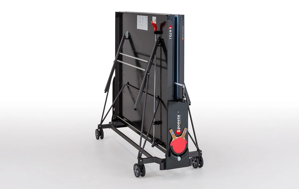 Pingpongový stôl Sponeta S4-72i je kvalitný stôl určený na športové účely alebo pre náročnejších rekreačných hráčov. Stôl je natoľko kvalitný, že naň poskytujeme predĺženú záruku na 3 roky. Výhodou tohto stola je možnosť lepšej stability pri premiestňovaní zbaleného stola v manipulačnej polohe - dosky sú blízko seba a na konštrukcii sú umiestnené 10 cm nad zemou. Stôl je určený na použitie v interiéri. Má brúsený povrch na doske s hrúbkou 19 mm. Táto doska už zaručuje trvalé vlastnosti pre rekreačnú hru na vyššej úrovni. Doska je navyše vystužená 50 mm oceľovým rámom, ktorý stôl ešte viac spevňuje. Nohy stola sú vyrobené z ocele. Stôl je na troch stranách vystužený kovovými tyčami. Vnútorná časť stola je vybavená štyrmi kolieskami na jednoduchú manipuláciu v zloženom stave - dve kolieska sú otočné. V strede stola sa nachádza držiak na pálky a loptičky. Súčasťou stola je kvalitná sieťka a kvalitný držiak na sieťku. Rozkladanie a skladanie stola sa ovláda z jedného miesta pomocou ťahadla, čo je výhoda oproti lacnejším stolom, ktoré majú blokovací mechanizmus na oboch stranách stola.