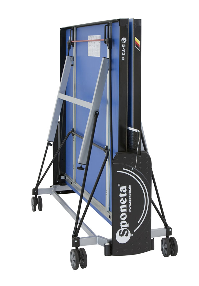 Stôl na stolný tenis Sponeta S5-73 e v modrej farbe na vonkajšie použitie. Ide o kvalitu, ktorá je porovnateľná s klasickými stolmi s drevenými doskami na použitie v interiéri. Pozinkovaný rám spolu s plastovou doskou z melamínu s hrúbkou 6 mm, ktorá má vlastnosti klasickej drevenej dosky, umožňujú trvalé umiestnenie stola v exteriéri (odporúčame však ponechať stôl vonku len od jari do jesene, aby sa predĺžila jeho životnosť - sneh a ľad môžu stôl mechanicky poškodiť), bez ohľadu na aktuálne poveternostné podmienky. Stôl je tak kvalitný, že naň poskytujeme predĺženú záruku 3 roky. Stôl sa dá zložiť bez nutnosti demontáže držiaka siete so sieťou. Výhodou tohto modelu je, že dosky sa dajú skladať len z jednej strany a nie je potrebné chodiť okolo stola alebo mať ďalšiu pomoc. Pevný rám z profilov 5 x 5 cm dodáva stolu veľkú stabilitu, ktorá sa vyrovná stolu v interiéri. Nohy stola sú vybavené plastovými skrutkami na vyrovnanie nerovností terénu. Súčasťou stola je aj kvalitný držiak na sieť a sieťka. 4 pogumované kolieska s priemerom 128 mm umožňujú tichý chod a uľahčujú manipuláciu so stolom. Rozmery stola v rozloženom stave sú 274 x 152,5 x 76 cm, celková šírka v zloženom stave na manipuláciu je 153 cm (184 cm vrátane zachovaných držiakov siete) x 65 cm x 155 cm vrátane výšky koliesok. Stôl obsahuje držiak na 2 pálky a 4 loptičky. Hmotnosť stola je 74 kg, s obalom 78 kg. K dispozícii v MODREJ farbe.