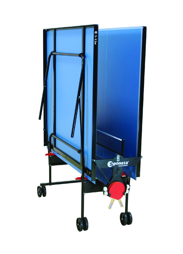 Stôl na stolný tenis Sponeta S1-13e outdoor. Pozinkovaný rám spolu so 4 mm hrubou plastovou doskou (melamín), ktorá má vlastnosti klasickej drevenej dosky, umožňujú trvalé umiestnenie stola v exteriéri (odporúčame však ponechať stôl vonku len od jari do jesene, aby sa predĺžila jeho životnosť - sneh a ľad môžu stôl mechanicky poškodiť) bez ohľadu na aktuálne poveternostné podmienky.