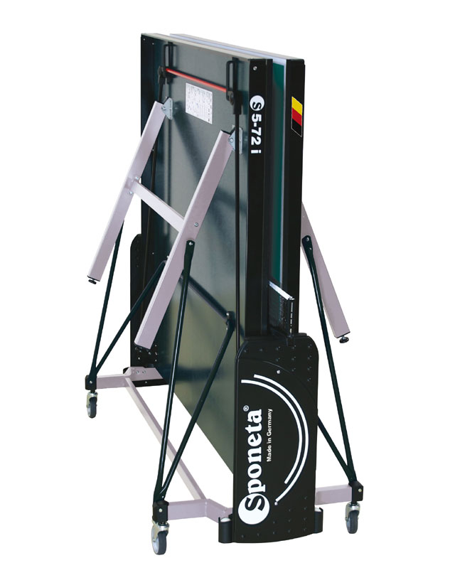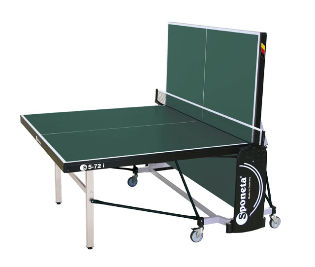 Pingpongový stôl Sponeta S5-72i je kvalitný interiérový stôl určený na súťažné účely.Stôl je natoľko kvalitný, že sa naň vzťahuje 3-ročná predĺžená záruka. Výhodou tohto stola je možnosť lepšej stability pri premiestňovaní zabaleného stola v manipulačnej polohe - dosky sú blízko seba a na konštrukcii sú umiestnené 10 cm nad zemou. Stôl je určený na použitie v interiéri. Má špeciálne brúsený povrch na 22 mm hrubej doske. Táto doska už zaručuje trvalé vlastnosti pretekárskej hry na vyššej úrovni. Doska je vystužená 50 mm oceľovým rámom, ktorý stôl ešte viac spevňuje. Nohy stola sú vyrobené z eloxovaného hliníka a majú mechanizmus na nastavenie výšky a vyrovnanie nerovností podlahy. Stôl je po vonkajších stranách vystužený kovovými tyčami. Vnútorná časť stola má štyri kolieska na manipuláciu v zloženom stave, 2 kolieska majú poistku proti pohybu. Uprostred stola je držiak na loptičky. Súčasťou výrobku je kvalitný držiak siete a sieť.