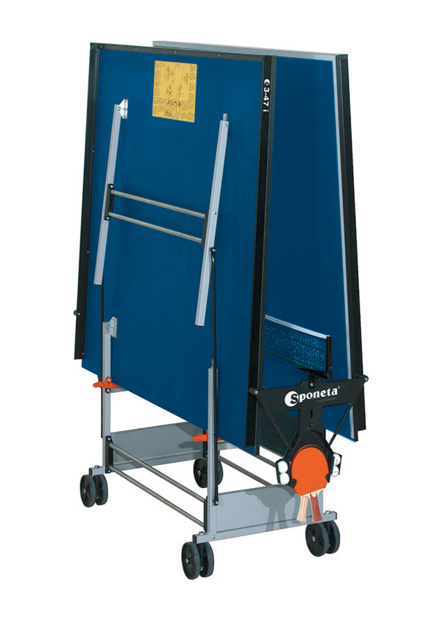Pingpongový stôl Sponeta S3-47i je kvalitný stôl určený na tréningové účely alebo pre náročnejších rekreačných hráčov. Stôl je tak kvalitný, že naň poskytujeme predĺženú záruku na 3 roky. Stôl je určený na použitie v interiéri. Má brúsený povrch na 19 mm hrubej doske. Táto doska už zaručuje konzistentný výkon pri rekreačnej hre na vyššej úrovni. Doska je vystužená 36 mm oceľovým rámom, ktorý stôl ešte viac spevňuje. Nohy stola sú vyrobené z ocele. Stôl je vystužený kovovými tyčami. Vnútorná časť stola je vybavená štyrmi kolieskami na manipuláciu v zloženom stave. Uprostred stola je držiak na pálky a loptičky. Súčasťou stola je sieťka a držiak na sieťku. Balenie stola je v kartóne, hmotnosť stola je 75 kg, hmotnosť vrátane obalu je 79 kg. Rozmery stola v rozloženom stave sú 274 x 152,5 x 76 cm, celková výška v zloženom stave na manipuláciu je 153 (184 cm vrátane zachovaných držiakov siete) x 65 cm x 189 cm vrátane výšky koliesok. Rozmery zabaleného stola sú 162 x 144 x 11,5 cm. Dostupné v MODREJ farbe.